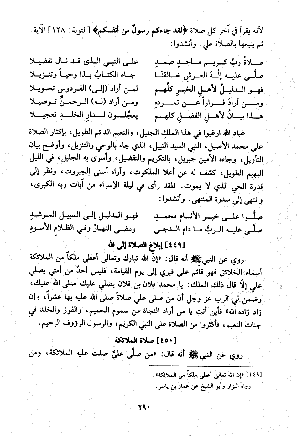 رُوِيَ عَن النَّبِي صلى الله عَلَيْهِ وَسلم أَنه قَالَ (إِن الله تبَارك وَتَعَالَى أعْطى ملكا من الْمَلَائِكَة أَسمَاء الْخَلَائق فَهُوَ قَائِم على قَبْرِي إِلَى يَوْم الْقِيَامَة فَلَيْسَ أحد من أمتِي يُصَلِّي عَليّ إِلَّا قَالَ ذَلِك الْملك يَا مُحَمَّد فلَان بن فلَان يُصَلِّي عَلَيْك صلى الله عَلَيْك وَضمن لي الرب عز وَجل أَن من صلى عَليّ صَلَاة صلى الله عَلَيْهِ بهَا عشرا وَإِن زَاد زَاده الله فَأَيْنَ أَنْت يَا من أَرَادَ النجَاة من سموم الْحَمِيم والفوز والخلد فِي جنَّات النَّعيم فَأَكْثرُوا من الصَّلَاة على النَّبِي الْكَرِيم وَالرَّسُول الرؤوف الرَّحِيم