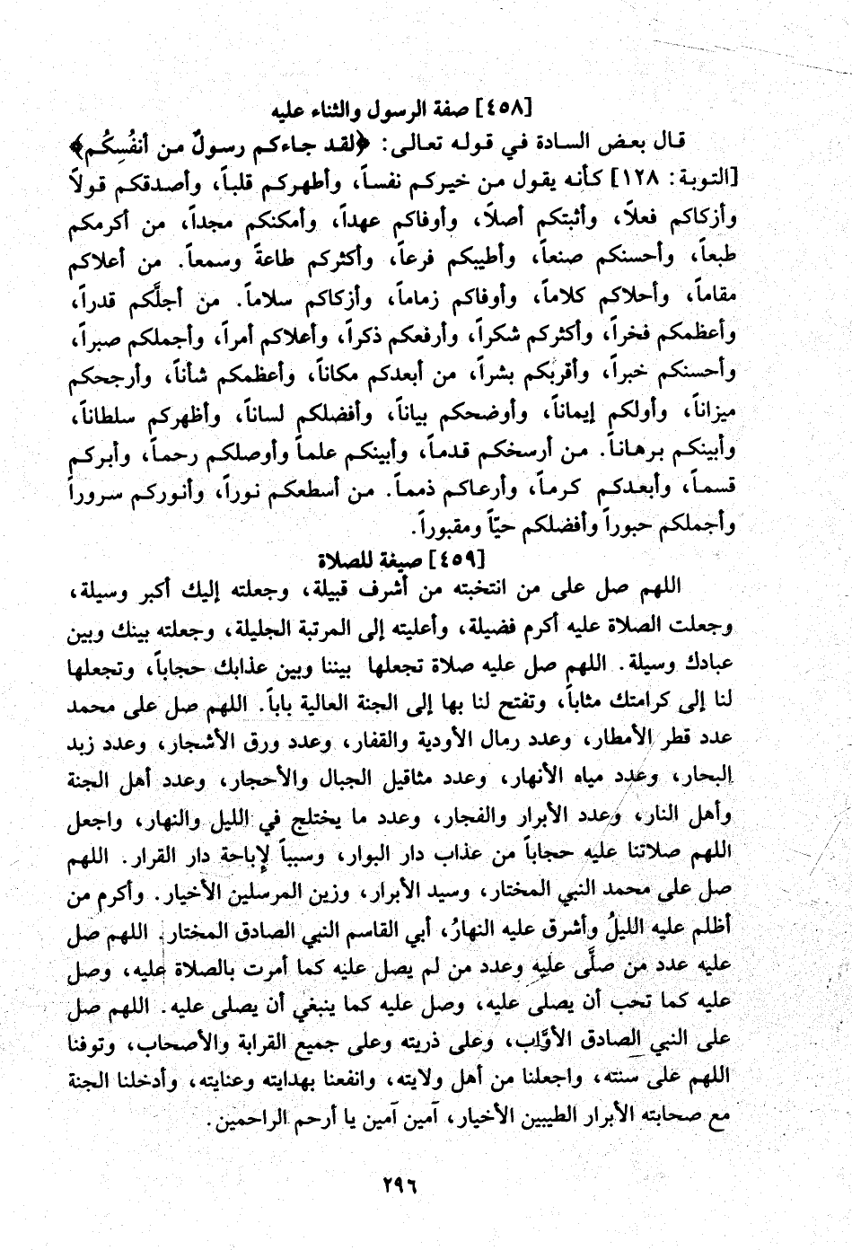 اللَّهُمَّ صل على النَّبِي الصَّادِق الأواب وعَلى ذُريَّته وعَلى جَمِيع الْقَرَابَة وَالْأَصْحَاب وتوفنا اللَّهُمَّ على سنته واجعلنا من أهل ولَايَته وانفعنا بهدايته وعنايته وأدخلنا الْجنَّة مَعَ صحابته الْأَبْرَار الطيبين الأخيار آمين آمين يَا أرْحم الرَّاحِمِينَ
