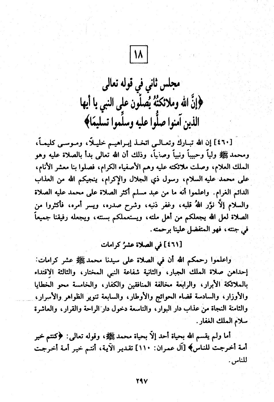 18 - مجْلِس ثَانِي فِي قَوْله تَعَالَى {إِن الله وَمَلَائِكَته يصلونَ على النَّبِي يَا أَيهَا الَّذين آمنُوا صلوا عَلَيْهِ وسلموا تَسْلِيمًا}