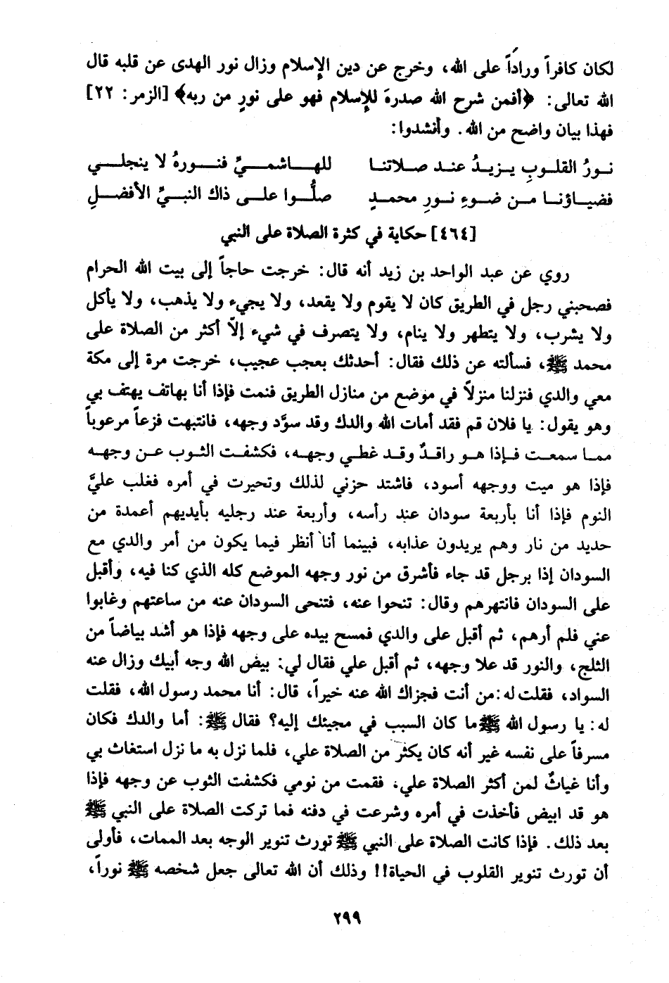 رُوِيَ عَن عبد الْوَاحِد بن زيد أَنه قَالَ خرجت حَاجا إِلَى بَيت الله الْحَرَام فصحبني رجل فِي الطَّرِيق كَانَ لَا يقوم وَلَا يقْعد وَلَا يَجِيء وَلَا يذهب وَلَا يَأْكُل وَلَا يشرب وَلَا يتَطَهَّر وَلَا ينَام وَلَا يتَصَرَّف فِي شَيْء إِلَّا أَكثر من الصَّلَاة على مُحَمَّد صلى الله عَلَيْهِ وَسلم فَسَأَلته عَن ذَلِك فَقَالَ أحَدثك بعجب عَجِيب خرجت مرّة إِلَى مَكَّة معي وَالِدي فنزلنا منزلا فِي مَوضِع من منَازِل الطَّرِيق فَنمت فَإِذا أَنا بهاتف يَهْتِف بِي وَهُوَ يَقُول يَا فلَان قُم فقد أمات الله والدك وَقد سود وَجهه فانتبهت فَزعًا مَرْعُوبًا مِمَّا سَمِعت فَإِذا هُوَ رَاقِد وَقد غطي وَجهه فَكشفت الثَّوْب عَن وَجهه فَإِذا هُوَ ميت وَوَجهه أسود فَاشْتَدَّ حزني لذَلِك وتحيرت فِي أمره فغلب عَليّ النّوم فَإِذا أَنا بأَرْبعَة سودان عِنْد رَأسه وَأَرْبَعَة عِنْد رجلَيْهِ بِأَيْدِيهِم أعمدة من حَدِيد من نَار وهم يُرِيدُونَ عَذَابه فَبَيْنَمَا أَنا أنظر فِيمَا يكون من أَمر وَالِدي مَعَ السودَان إِذا بِرَجُل قد جَاءَ فأشرق من نور وَجهه الْموضع كُله الَّذِي كُنَّا فِيهِ وَأَقْبل على السودَان فانتهرهم وَقَالَ تنحوا عَنهُ فَتنحّى السودَان عَنهُ من ساعتهم وغابوا عني فَلم أرهم ثمَّ أقبل على وَالِدي فَمسح بِيَدِهِ على وَجهه فَإِذا هُوَ أَشد بَيَاضًا من الثَّلج والنور قد علا وَجهه ثمَّ أقبل عَليّ فَقَالَ لي بيض الله وَجه أَبِيك وَزَالَ عَنهُ السوَاد فَقلت لَهُ من أَنْت فجزاك الله عَنهُ خيرا قَالَ أَنا مُحَمَّد رَسُول الله فَقلت لَهُ يَا رَسُول الله صلى الله عَلَيْهِ وَسلم مَا كَانَ السَّبَب فِي مجيئك إِلَيْهِ فَقَالَ صلى الله عَلَيْهِ وَسلم أما والدك فَكَانَ مُسْرِفًا على نَفسه غير أَنه كَانَ يكثر من الصَّلَاة عَليّ فَلَمَّا نزل بِهِ مَا نزل اسْتَغَاثَ بِي وَأَنا غياث لمن أَكثر الصَّلَاة عَليّ فَقُمْت من نومي فَكشفت الثَّوْب عَن وَجهه فَإِذا هُوَ قد ابيض فَأخذت فِي أمره وشرعت فِي دَفنه فَمَا تركت الصَّلَاة على النَّبِي صلى الله عَلَيْهِ وَسلم بعد ذَلِك
