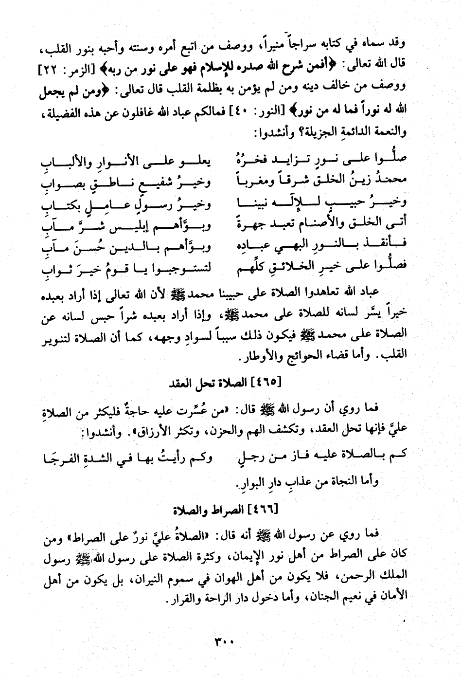 فَمَا رُوِيَ عَن رَسُول الله صلى الله عَلَيْهِ وَسلم أَنه قَالَ (الصَّلَاة عَليّ نور على الصِّرَاط) وَمن كَانَ على الصِّرَاط من أهل نور الْإِيمَان وَكَثْرَة الصَّلَاة على رَسُول الله صلى الله عَلَيْهِ وَسلم رَسُول الْملك الرَّحْمَن فَلَا يكون من أهل الهوان فِي سموم النيرَان بل يكون من أهل الْأمان فِي نعيم الْجنان وَأما دُخُول دَار الرَّاحَة والقرار