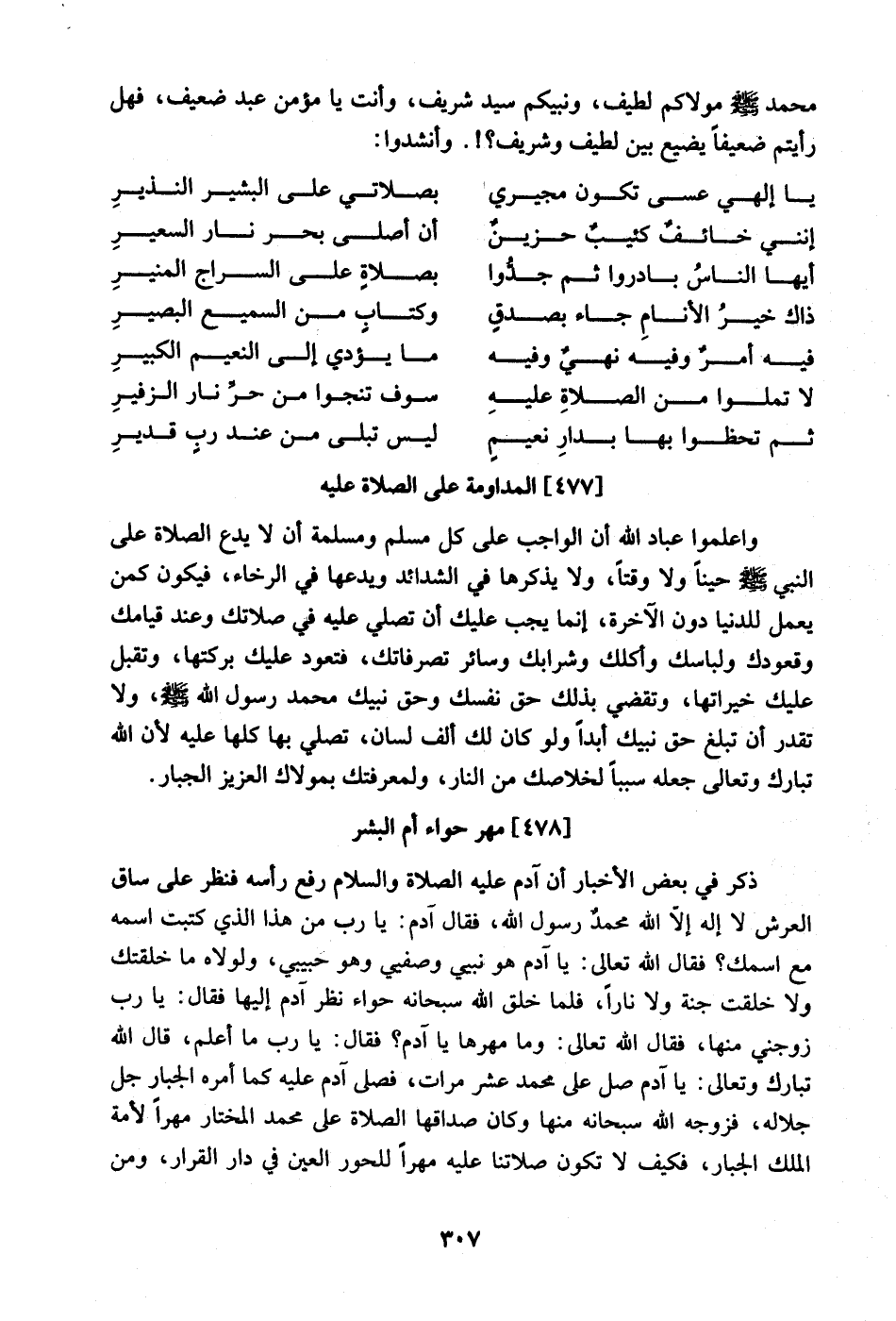 ذكر فِي بعض الْأَخْبَار أَن آدم عَلَيْهِ الصَّلَاة وَالسَّلَام رفع رَأسه فَنظر على سَاق الْعَرْش لَا إِلَه إِلَّا الله مُحَمَّد رَسُول الله فَقَالَ آدم يَا رب من هَذَا الَّذِي كتبت اسْمه مَعَ اسْمك فَقَالَ الله تَعَالَى يَا آدم هُوَ نبيي وصفيي وَهُوَ حَبِيبِي ولولاه مَا خلقتك وَلَا خلقت جنَّة وَلَا نَارا فَلَمَّا خلق الله سُبْحَانَهُ حَوَّاء نظر آدم إِلَيْهَا فَقَالَ يَا رب زَوجنِي مِنْهَا فَقَالَ الله تَعَالَى وَمَا مهرهَا يَا آدم فَقَالَ يَا رب مَا أعلم قَالَ الله تبَارك وَتَعَالَى يَا آدم صل على مُحَمَّد عشر مَرَّات فصلى آدم عَلَيْهِ كَمَا أمره الْجَبَّار جلّ جَلَاله فَزَوجهُ الله سُبْحَانَهُ مِنْهَا وَكَانَ صَدَاقهَا الصَّلَاة على مُحَمَّد الْمُخْتَار مهْرا لأمة الْملك الْجَبَّار فَكيف لَا تكون صَلَاتنَا عَلَيْهِ مهْرا للحور الْعين فِي دَار الْقَرار وَمن