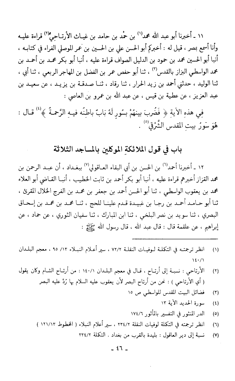 11 - أخبرنَا أَبُو عبد الله مُحَمَّدُ بْنُ حَمْدِ بْنِ حَامِدِ بْنِ غَيَّاثٍ الْأَرْتَاحِيُّ قِرَاءَةً عَلَيْه وَأَنَا أَسْمَعُ بِمِصْرَ قِيلَ لَهُ أَخْبَرَكُمْ أَبُو الْحَسَنِ عَلِيُّ بْنُ الْحِسَيْنِ بْنِ عُمَرَ الْمَوْصِلِيُّ الْفَرَّاءُ فِي كِتَابِهِ أنبا أَبُو الْحُسَيْنِ مُحَمَّدُ بْنُ حَمُودِ بْنِ الدَّلِيلِ الصَّوَّافُ قِرَاءَةً عَلَيْهِ أنبا أَبُو بَكْرٍ مُحَمَّدُ بْنُ أَحْمَدَ بْنِ مُحَمَّدِ الْوَاسِطِيُّ الْبَّزَّازُ بِالْقُدْسِ ثَنَا أَبُو حَفْصٍ عَمَرُ بْنُ الفْضَلِ بْنِ الْمُهَاجِرِ الرَّبْعِيُّ ثَنَا أَبِي ثَنَا الْوَلِيدُ حَدَّثَنِي أَحْمَدُ بْنُ زَيْدٍ الْحَرَّارُ ثَنَا رُقَادُ ثَنَا صَدَقَةُ بْنُ يَزِيدَ عَنْ سَعِيدِ بْنِ عَبْدِ الْعَزِيزِ عَنْ عَطِيَّةَ بن قيس عَن عبد الله بْنِ عَمْرِو بْنِ الْعَاصِ