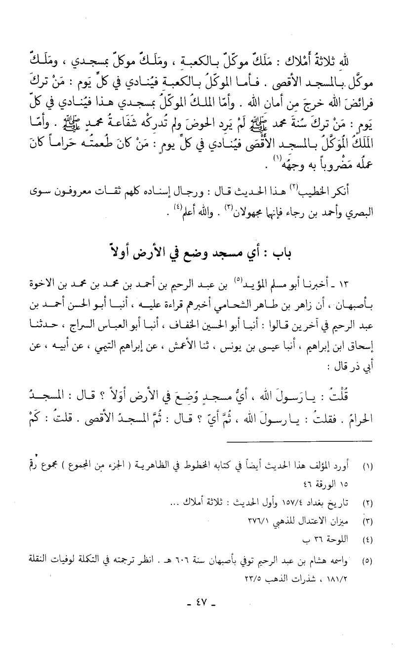 قُلْتُ يَا رَسُولَ اللَّهِ أَيُّ مَسْجِدٍ وُضِعَ فِي الْأَرْضِ أَوَلًا قَالَ الْمَسْجِدُ الْحَرَامُ فَقُلْتَ يَا رَسُولَ اللَّه ثُمَّ أَيُّ قَالَ ثُمَّ الْمَسْجِدُ الْأَقْصَى قُلْتُ كَمْ