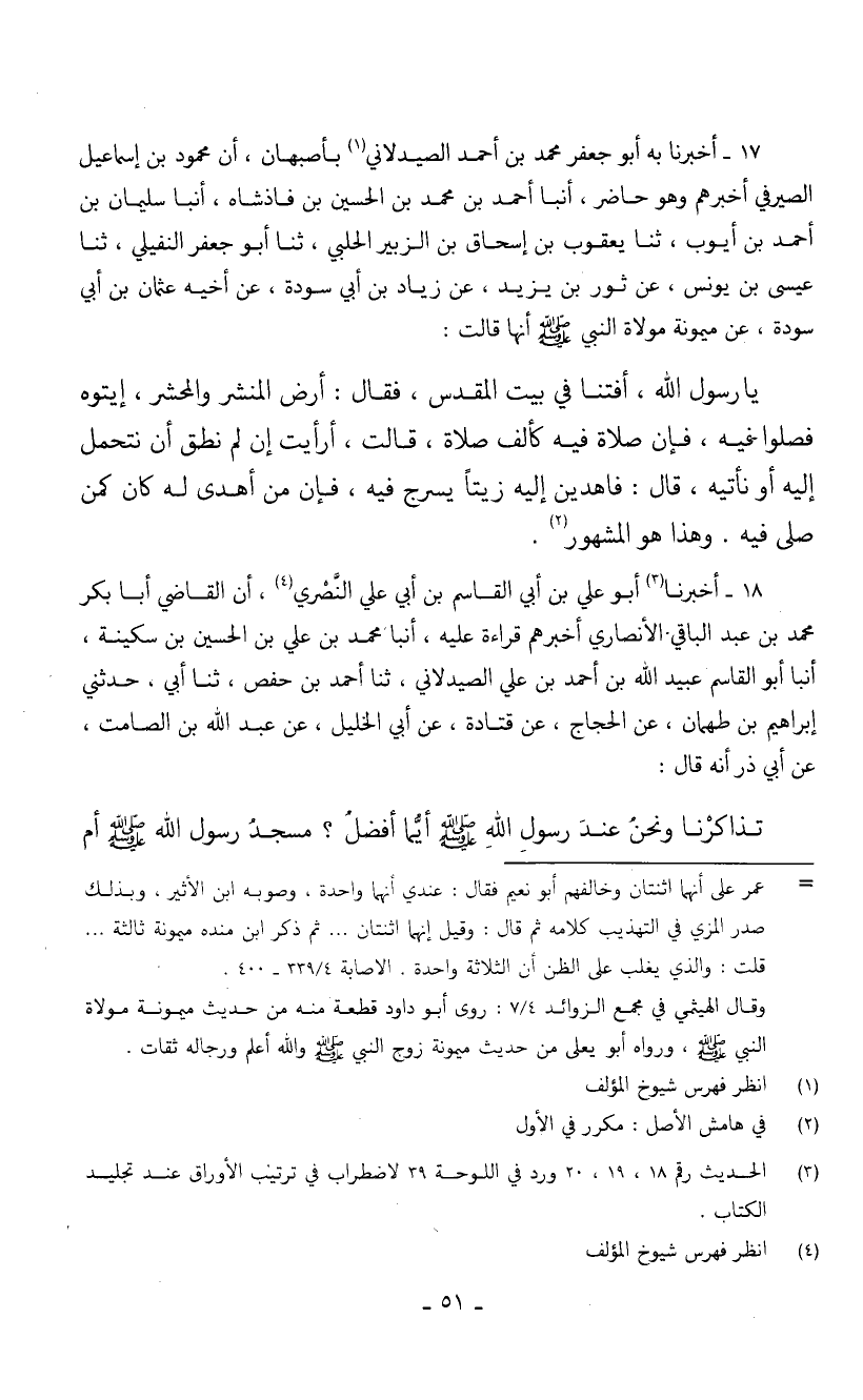 17 - أَخْبَرَنَا بِهِ أَبُو جَعْفَرٍ مُحَمَّدُ بْنُ أَحْمَدَ الصَّيْدَلَانِيُّ بِأَصْبَهَانَ أَنَّ مَحْمُودَ بْنَ إِسْمَاعِيلَ الصَّيْرَفِيَّ أَخْبَرَهُمْ وَهُوَ حَاضِرٌ أنبا أَحْمَدُ بْنُ مُحَمَّدِ بْنِ الْحُسَيْنِ بْنِ فَاذْشَاهَ أَنْبَا سُلَيْمَانُ بْنُ أَحْمَدَ بْنِ أَيُّوبَ ثَنَا يَعْقُوبُ بْنُ إِسْحَاقَ بْنِ الزُّبَيْرِ الْحَلَبِيُّ ثَنَا أَبُو جَعْفَرٍ النُّفَيْلِيُّ ثَنَا عِيسَى بْنُ يُونُسَ عَنْ ثَوْرِ بْنِ يَزِيدَ عَنْ زِيَادِ بْنِ أَبِي سَوْدَةَ عَنْ أَخِيهِ عُثْمَانَ بْنِ أَبِي سَوْدَةَ عَنْ مَيْمُونَةَ مَوْلَاةِ النَّبِيِّ صَلَّى اللَّه عَلَيْهِ وَسَلَّمَ أَنَّهَا قَالَتْ يَا رَسُولَ اللَّهِ أَفْتِنَا فِي بَيْتِ الْمَقْدِسِ فَقَالَ أَرْضُ الْمَنْشَرِ والْمَحْشَرِ إَيتُوهُ فَصَلُّوا فِيهِ فَإِنَّ صَلَاةً فِيهِ كَأَلْفِ صَلَاةٍ قَالَتْ أَرَأَيْتَ إِنْ لَمْ نُطِقْ أَنْ نَتَحَمَلَ إِلَيْهِ أَوْ نَأْتِيَهُ قَالَ فَأَهْدِينَ إِلَيْهِ زَيْتًا يُسْرَجُ فِيهِ فَإِنَّ مَنْ أَهْدَى لَهُ كَانَ كَمَنْ صَلَّى فِيهِ وَهَذَا هُوَ الْمَشْهُورُ