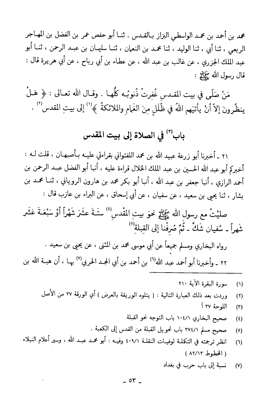21 - أَخْبَرَنَا أَبُو زرْعَة عبيد الله بْنُ مُحَمَّدِ اللِّفْتِوَانِيُّ بِقِرَاءَتِي عَلَيْهِ بِأَصْبَهَانَ قُلْتُ لَهُ أَخْبَرَكُمْ أَبُو عبد الله الْحُسَيْن بن عبد الملك الْخَلَّالُ قِرَاءَةً عَلَيْهِ أنبا أَبُو الْفضل عبد الرحمن بْنُ أَحْمَدَ الرَّازِيُّ أنبا جَعْفَرُ بن عبد الله أَنْبَا أَبُو بَكْرٍ مُحَمَّدُ بْنُ هَارُونَ الرُّويَانِيُّ ثَنَا مُحَمَّدُ بْنُ بَشَّارٍ ثَنَا يَحْيَى بْنُ سَعِيدٍ عَنْ سُفْيَانَ عَنْ أَبِي إِسْحَاقَ عَنِ الْبَرَّاءِ بْنِ عَازِبٍ قَالَ صَلَّيْتُ مَعَ رَسُولِ اللَّهِ صَلَّى اللَّهُ عَلَيْهِ وَسَلَّمَ نَحْوَ بَيْتِ الْمَقْدِسِ سِتَةَ عَشَرَ شَهْرًا أَوْ سَبْعَةَ عَشَرَ شَهْرًا سُفْيَانُ شَكَّ ثُمَّ صَرَفَنَا إِلَى الْقِبْلَةِ