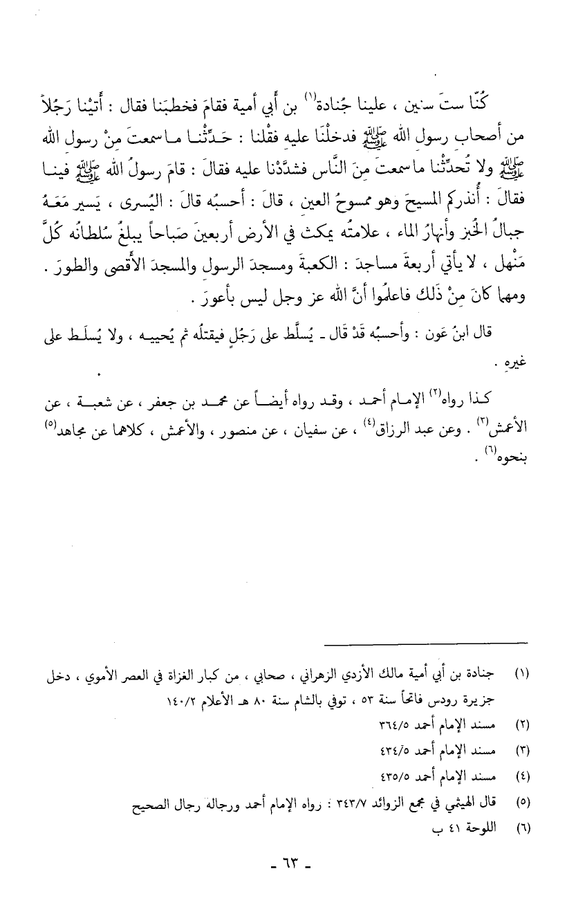 كُنَّا سِتَ سِنِينَ عَلَيْنَا جُنَادَةُ بْنُ أَبِي أُمَيَّةَ فَقَامَ فَخَطَبَنَا فَقَالَ أَتَيْنَا رَجُلًا مِنْ أَصْحَابِ رَسُولُ اللَّه صَلَّى اللَّه عَلَيْهِ وَسَلَّمَ فَدَخَلْنَا عَلَيْه فَقُلْنَا حَدِّثْنَا مَا سَمِعْتَ مِنْ رَسُوِل اللَّهِ صَلَّى اللَّهُ عَلَيْهِ وَسَلَّمَ وَلَا تُحَدِّثْنَا مَا سَمِعْتَ مِنَ النَّاسِ فَشَدَّدْنَا عَلَيْهِ فَقَالَ قَامَ رَسُولُ اللَّه صَلَّى اللَّه عَلَيْهِ وَسَلَّمَ فِينَا فَقَال أُنْذِرُكُمُ الْمَسِيحَ وَهُوَ مَمْسُوحُ الْعَيْنِ قَالَ أَحْسَبُهُ قَالَ الْيُسْرَى يَسِيرُ مَعَهُ جِبَالُ الْخُبْزِ وَأَنْهَارُ الْمَاءِ عَلَامَتُهُ يَمْكُثُ فِي الْأَرْضِ أَرْبَعِينَ صَبَاحًا يَبْلُغُ سُلْطَانُهُ كَلَّ مَنْهَلٍ لَا يَأْتِي أَرْبَعَةَ مَسَاجِدَ الْكَعْبَةَ وَمَسْجِدَ الرَّسُولِ وَالْمَسْجِدَ الْأَقْصَى وَالطُّورَ وَمَهْمَا كَانَ مِنْ ذَلِكَ فَاعْلَمُوا أَنَّ اللَّهَ عَزَّ وَجَلَّ لَيْسَ بِأَعْوَرَ