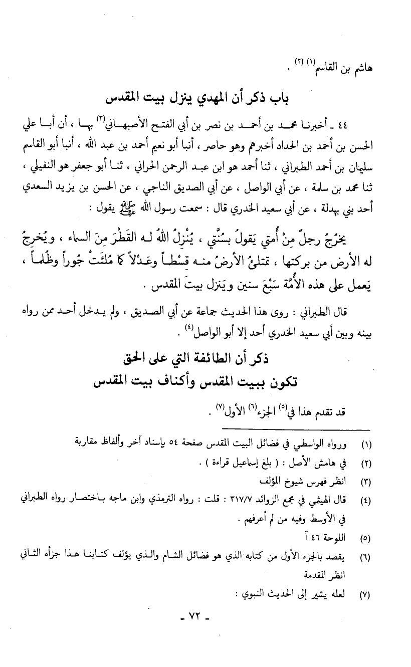 الطَّبَرَانِيُّ رَوَى هَذَا الْحَدِيثَ جَمَاعَةٌ عَنْ أَبِي الصِّدِّيقِ وَلَمْ يَدْخُلْ أَحَدٌ مِمَّنْ رَوَاهُ بَيْنَهُ وَبَيْنَ أبي سعيد الْخُدْرِيّ أحد إِلَّا أَبُو الْوَاصِل رَوَاهُ الترمذى وَابْن ماجة بِاخْتِصَار رَوَاهُ عَلَى الْحَقِّ تَكُونُ بِبَيْتِ الْمَقْدِسِ وَأَكْنَافِ بَيْتِ الْمَقْدِسِ