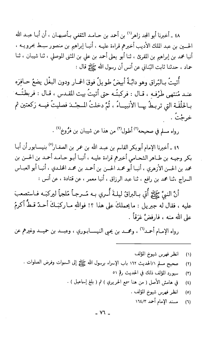 أُتِيتُ بِالْبُرَاقِ وَهُوَ دَابَّةٌ أَبْيَضُ طَوِيلٌ فَوْقَ الْحِمَارِ وَدُونَ الْبَغْلِ يَضَعُ حَافِرَهُ عِنْدَ مَنْتَهَى طَرَفِهِ قَالَ فَرَكِبْتُهُ حَتَّى أَتَيْتُ بَيْتَ الْمَقْدِسِ قَالَ فَرَبَطْتُهُ بِالْحَلَقَةِ الَّتِي تَرْبِطُ بِهَا الْأَنْبِيَاءُ ثُمَّ دَخَلْتُ الْمَسْجِدَ فَصَلَّيْتُ فِيهِ رَكْعَتَيْنِ ثُمَّ خَرَجْتُ