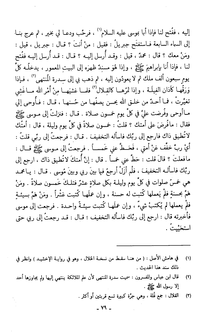 إِلَيْهِ فَفتح لنا فَإِذا أَبَا بِمُوسَى عَلَيْهِ السَّلَامُ فَرَحَّبَ وَدَعَا لِي بِخَيْرٍ ثُمَّ عَرَجَ بِنَا إِلَى السَّمَاءِ السَّابِعَةِ فَاسْتَفْتَحَ جِبْرِيلُ فَقِيل مَنْ أَنْتَ قَالَ جِبْرِيلُ قِيلَ وَمَنْ مَعَكَ قَالَ مُحَمَّدٌ قِيلَ وَقَدْ أُرْسِلَ إِلَيْهِ قَالَ قَدْ أُرْسِلَ إِلَيْهِ فَفُتِحَ لَنَا فَإِذَا أَنَا بِإِبْرَاهِيمَ صَلَّى اللَّهُ عَلَيْهِ وَسَلَّمَ وَإِذَا هُوَ مُسْنِدٌ ظَهْرَهُ إِلَى الْبَيْتِ الْمَعْمُورِ يَدْخُلُهُ كَلَّ يَوْمٍ سَبْعُونَ أَلْفَ مَلَكٍ ثُمَّ لَا يَعُودُونَ إِلَيْهِ ثُمَّ ذَهَبَ بِي إِلَى سِدْرَةِ الْمُنْتَهَى فَإِذَا وَرَقُهَا كَآذَانِ الْفِيَلَة وَإِذَا ثَمَرُهَا كَالْقِلَالِ فَلَمَّا غَشِيَهَا مَنْ أَمْرِ اللَّهِ مَا غَشِيَ تَغَيَّرَتْ فَمَا أَحَدٌ مِنْ خَلْقِ اللَّهِ يُحْسِنُ يَصِفُهَا مِنْ حُسْنِهَا قَالَ فَأُوحِيَ إِلَيَّ مَا أُوحِيَ وَفُرِضَتْ عَلَيَّ فِي كُلِّ يَوْمٍ خَمْسُونَ صَلَاةً قَالَ فنَزَلْتُ إِلَى مُوسَى صَلَّى اللَّهُ عَلَيْهِ وَسَلَّمَ فَقَالَ مَا فُرِضَ عَلَى أُمَّتِكَ قَلْتُ خَمْسُونَ صَلَاةً فِي كَلِّ يَوْمٍ وَلَيْلَةٍ قَالَ أُمَّتُكَ لَا تُطِيقُ ذَاكَ فَأرْجِعْ إِلَى رَبِّكَ فَاسْأَلْهُ التَّخْفِيفَ قَالَ فَرَجَعْتُ إِلَى رَبِّي قَلْتُ أَيْ رَبِّ خَفِّفْ عَنْ أُمَّتِي فَحَطَّ عَنِّي خَمْسًا فَرَجَعْتُ إِلَى مُوسَى صَلَّى اللَّهُ عَلَيْهِ وَسَلَّمَ قَالَ مَا فَعَلْتَ قَالَ قُلْتُ حَطَّ عَنِّي خَمْسًا قَالَ إِنَّ أِمَّتُكَ لَا تُطِيقُ ذَاكَ أرْجِعْ إِلَى رَبِّكَ فَاسْأَلْهُ التَّخْفِيفَ فَلَمْ أَزَلْ أَرْجِعُ فِيمَا بَيْنَ رَبِّي وَبَيْنَ مُوَسى قَالَ يَا مُحَمَّدُ هِيَ خَمْسُ صَلَوَاتٍ فِي كَلِّ يَوْمٍ وَلَيْلَةٍ بِكُلِّ صَلَاةٍ عَشْرٌ فَتِلْكَ خَمْسُونَ صَلَاةً وَمَنْ هَمَّ بِحَسَنَةٍ فَلَمْ يَعْمَلْهَا كَتِبَتْ لَهُ حَسَنَةٌ وَإِنْ عَمِلَهَا كُتِبَتْ عَشْرًا وَمَنْ هَمَّ بِسَيِّئَةٍ فَلَمْ يَعْمَلْهَا لَمْ يُكْتُبْ شَيْءٌ وَإِنْ عَمِلَهَا كُتِبَتْ سَيِّئَةٌ وَاحِدَةٌ فَرَجَعْتُ إِلَى مُوسَى فَأَخْبَرْتُهُ قَالَ ارْجِعْ إِلَى رَبِّكَ فَاسْأَلْهُ التَّخْفِيفَ قَالَ قَدْ رَجَعْتُ إِلَى رَبِّي حَتَّى اسْتَحَيَيْتُ