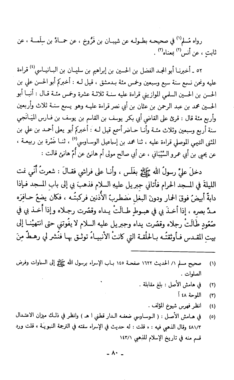 دَخَلَ عَلَيَّ رَسُولُ اللَّهِ صَلَّى اللَّهُ عَلَيْهِ وَسَلَّمَ بِغَلَسٍ وَأَنَا عَلَى فِرَاشِي فَقَالَ شَعُرْتُ أَنِّي نِمْتُ اللَّيْلَةَ فِي الْمَسْجِدِ الْحَرَامِ فَأَتَانِي جِبْرِيلُ عَلَيْهِ السَّلَامُ فَذَهَبَ بِي إِلَى بَابِ الْمَسْجِدِ فَإِذَا دَابَّةٌ أَبْيَضٌ فَوْقَ الْحِمَارِ وَدُونَ الْبَغْلِ مُضْطَرِبُ الْأُذُنَيْنِ فَرَكِبْتُهُ فَكَانَ يَضَعُ حَافِرَهُ مَدَّ بَصَرِهِ إِذَا أَخَذَ بِي فِي هُبُوطٍ طَالَتْ يَدَاهُ وَقَصُرَتْ رِجْلَاهُ وَإِذَا أَخَذَ بِي فِي صُعُودٍ طَالَتْ رِجْلَاهُ وَقَصُرَتْ يَدَاهُ وَجِبْرِيلُ عَلَيْهِ السَّلَامُ لَا يَفُوتُنِي حَتَّى انْتَهَيْنَا إِلَى بَيْتِ الْمَقْدِسِ فَأَوْثَقْتُهُ بِالْحَلْقَةِ الَّتِي كَانَتِ الْأَنْبِيَاءُ تُوثِقُ بِهَا فَنُشِرَ لِي رَهْطٌ مِنَ
