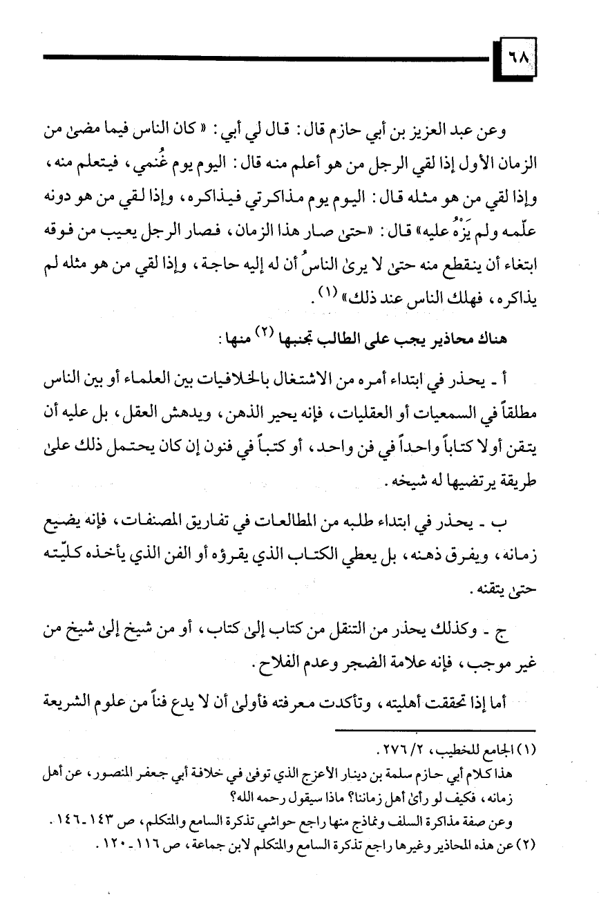 ب - يحذر في ابتداء طلبه من المطالعات في تفاريق المصنفات، فإنه يضيع زمانه، ويفرق ذهنه، بل يعطي الكتاب الذي يقرؤه أو الفن الذي يأخذه كليّته حتى يتقنه.