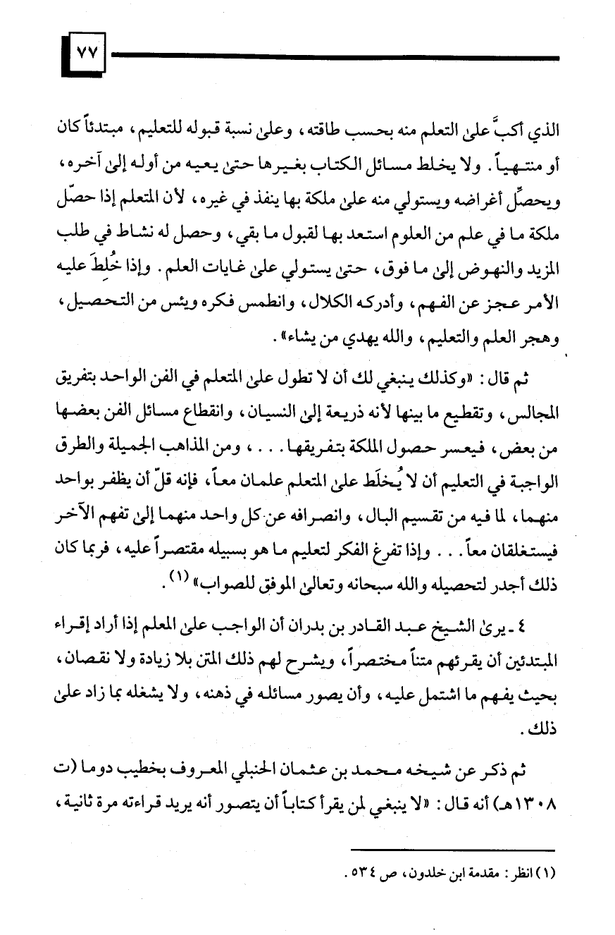 الذي أكبَّ على التعلم منه بحسب طاقته، وعلى نسبة قبوله للتعليم، مبتدئاً كان أو منتهياً. ولا يخلط مسائل الكتاب بغيرها حتى يعيه من أوله إلى آخره، ويحصِّل أغراضه ويستولي منه على ملكة بها ينفذ في غيره، لأن المتعلم إذا حصّل ملكة ما في علم من العلوم استعد بها لقبول ما بقي، وحصل له نشاط في طلب المزيد والنهوض إلى ما فوق، حتى يستولي على غايات العلم. وإذا خُلِطَ عليه الأمر عجز عن الفهم، وأدركه الكلال، وانطمس فكره ويئس من التحصيل، وهجر العلم والتعليم، والله يهدي من يشاء".
