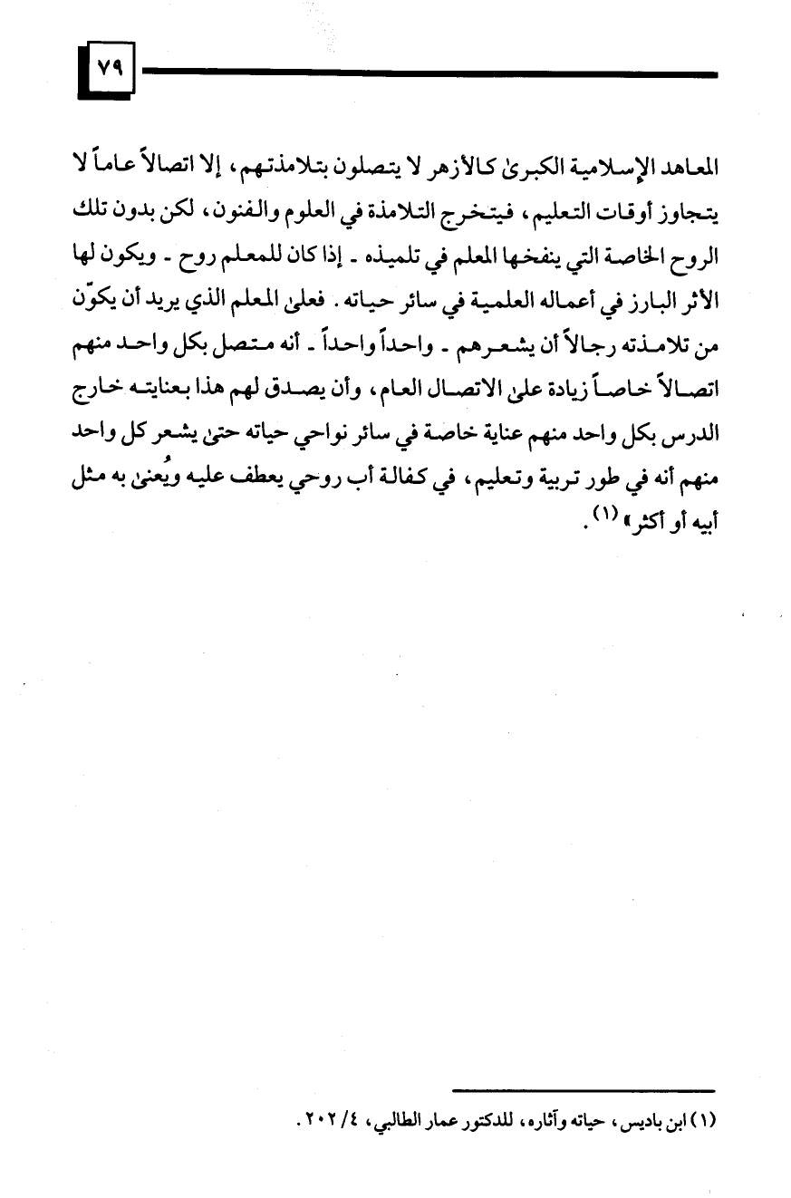 المعاهد الإسلامية الكبرى كالأزهر لا يتصلون بتلامذتهم، إلا اتصالاً عاماً لا يتجاوز أوقات التعليم، فيتخرج التلامذة في العلوم والفنون، لكن بدون تلك الروح الخاصة التي ينفخها المعلم في تلميذه - إذا كان للمعلم روح - ويكون لها الأثر البارز في أعماله العلمية في سائر حياته. فعلى المعلم الذي يريد أن يكوّن من تلامذته رجالاً أن يشعرهم - واحداً واحداً - أنه متصل بكل واحد منهم اتصالاً خاصاً زيادة على الاتصال العام، وأن يصدق لهم هذا بعنايته خارج الدرس بكل واحد منهم عناية خاصة في سائر نواحي حياته حتى يشعر كل واحد منهم أنه في طور تربية وتعليم، في كفالة أب روحي يعطف عليه ويُعنى به مثل أبيه أو أكثر" 1.