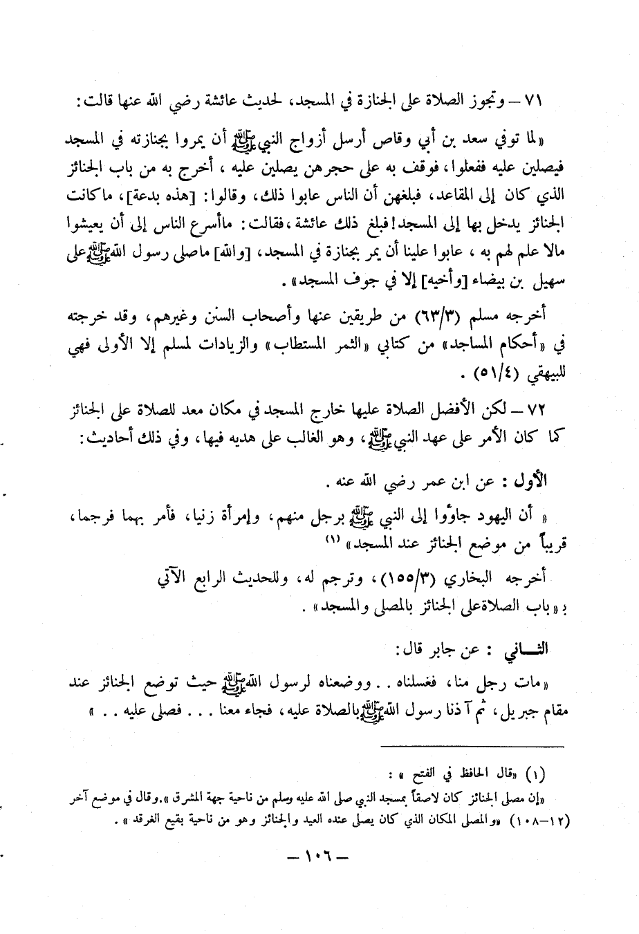 72 - لكن الأفضل الصلاة عليها خارج المسجد في مكان معد للصلاة على الجنائز كما كان الأمر على عهد النبي صلى الله عليه وسلم، وهو الغالب على هديه فيها " وفي ذلك أحاديث: