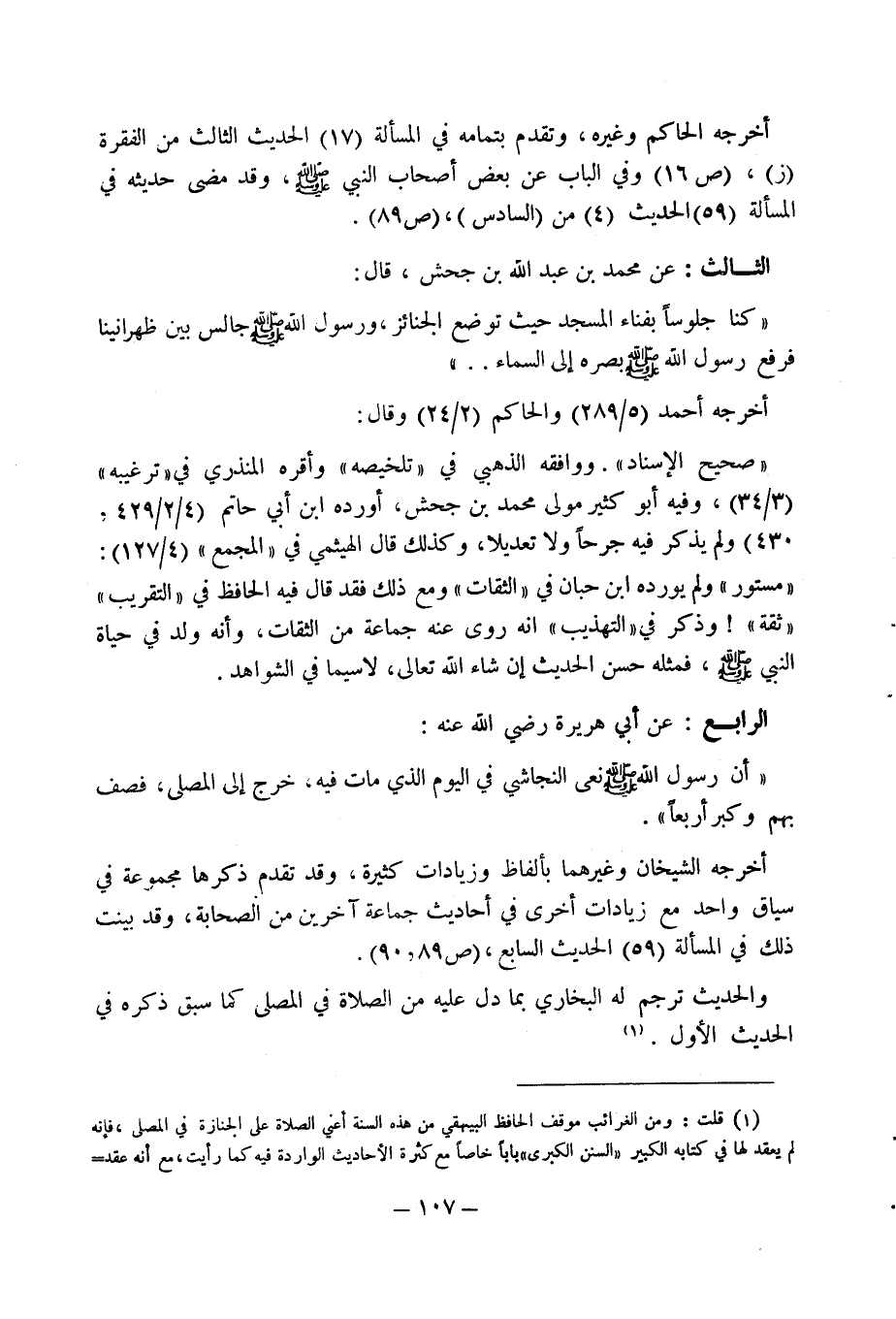 الثالث: عن محمد بن عبد الله بن جحش، قال: " كنا جلوس بفناء المسجد حيث توضع الجنائز ورسول الله صلى الله عليه وسلم جالس بين ظهرانينا فرفع رسول الله صلى الله عليه وسلم بصره إلى السماء .. أخرجه أحمد (5/ 289) والحاكم (2/ 24) وقال: " صحيح الاسناد ".
