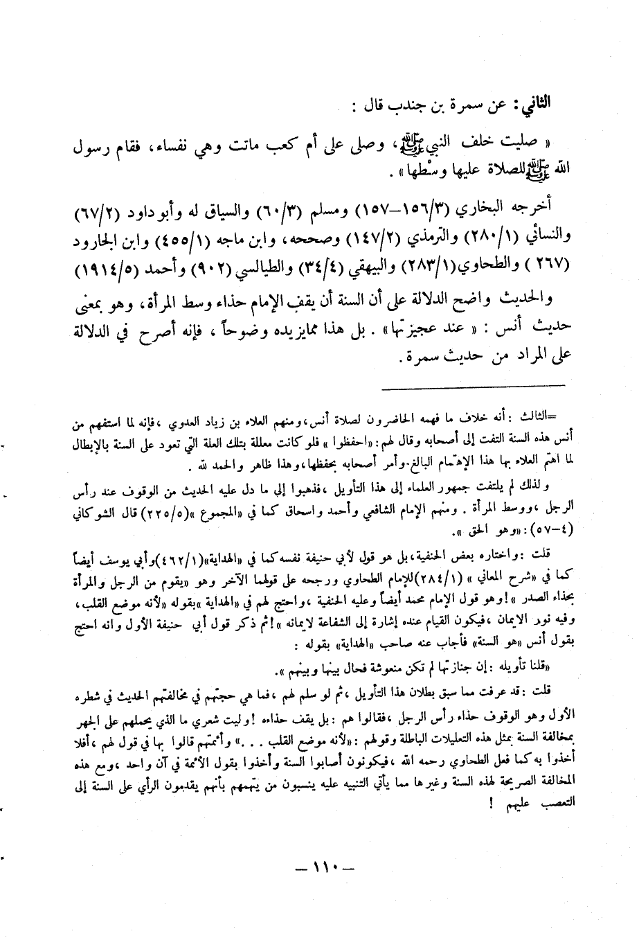 قلت: قد عرفت مما سبق بطلان هذا التأويل، ثم لو سلم لهم " فما هي حجتهم في مخالفتهم الحديث في شطره الأول وهو الوقوف حذاء رأس الرجل، فقالوا هم: بل يقف حذاءه وليت شعري ما الذي يحملهم على الجهر بمخالفة السنة بمثل هذه التعليلات الباطلة وقولهم: " لانه موضع القلب .. ائتهم قالوا بها في قول لهم، أفلا اخذوا به كما فعل الطحاوي رحمه الله فيكونون اصابوا السنة واخذوا بقول الائمة في آن واحد ومع هذه المخالفة الصريحة لهذه السنة وغيرها مما ياتي التشبيه عليه ينسبون من يتمهم بانهم يقدمون الرأي على السنة إلى التعصب عليه!