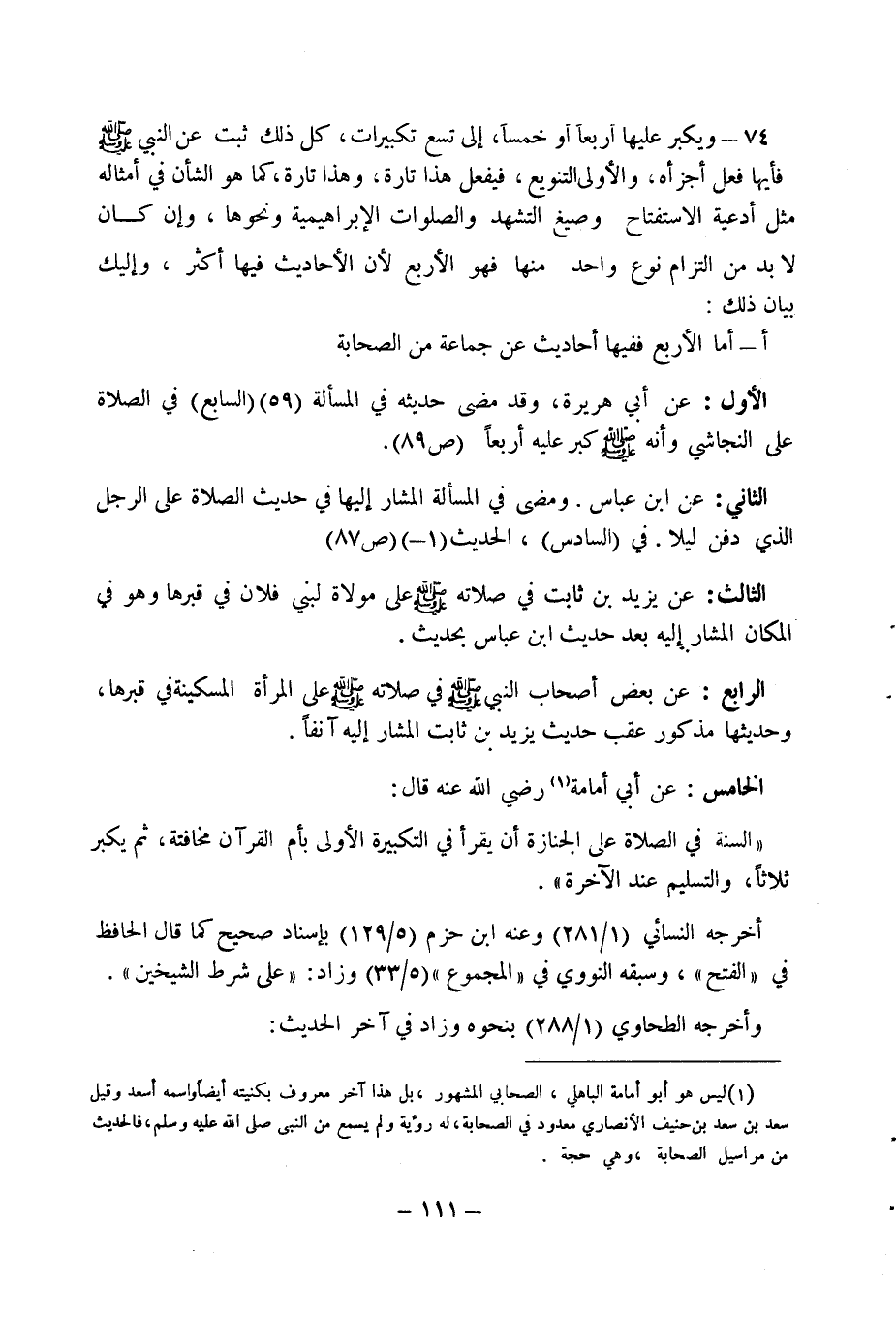 74 - ويكبر عليها أربعا أو خمسا، إلى تسع تكبيرات، كل ذلك ثبت عن النبي صلى الله عليه وسلم فأيها فعل أجزأه، والأولى التنويع، فيفعل هذا تارة، وهذا تارة، كما هو الشأن في أمثاله مثل أدعية الاستفتاح وصيغ التشهد والصلوات الابراهيمية ونحوها، وإن كان لابد من التزام نوع واحد منها فهو الاربع لان الاحاديث فهيا أكثر، وإليك بيان ذلك: