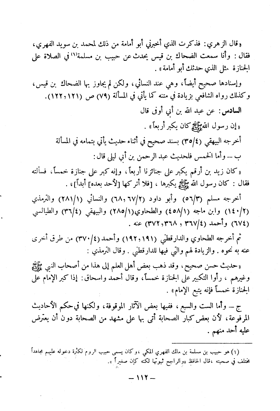ب - وأما الخمس فلحديث عبد الرحمن بن أبي ليلى قال: " كان زيد بن أرقم يكبر على جنائزنا أربعا، وإنه كبر على جنازة خمسا، فسألته فقال: كان رسول الله صلى الله عليه وسلم يكبرها، (فلا أتركها (لاحد بعده) أبدا) " أخرجه مسلم (3/ 56) وأبو داود (2/ 67، 68) والنسائي (1/ 281) والترمذي (2/ 140) وابن ماجه (1/ 458) والطحاوي (1/ 285) والبيهقي (4/ 36) والطيالسي (674) وأحمد (4/ 367، 368، 372) عنه.