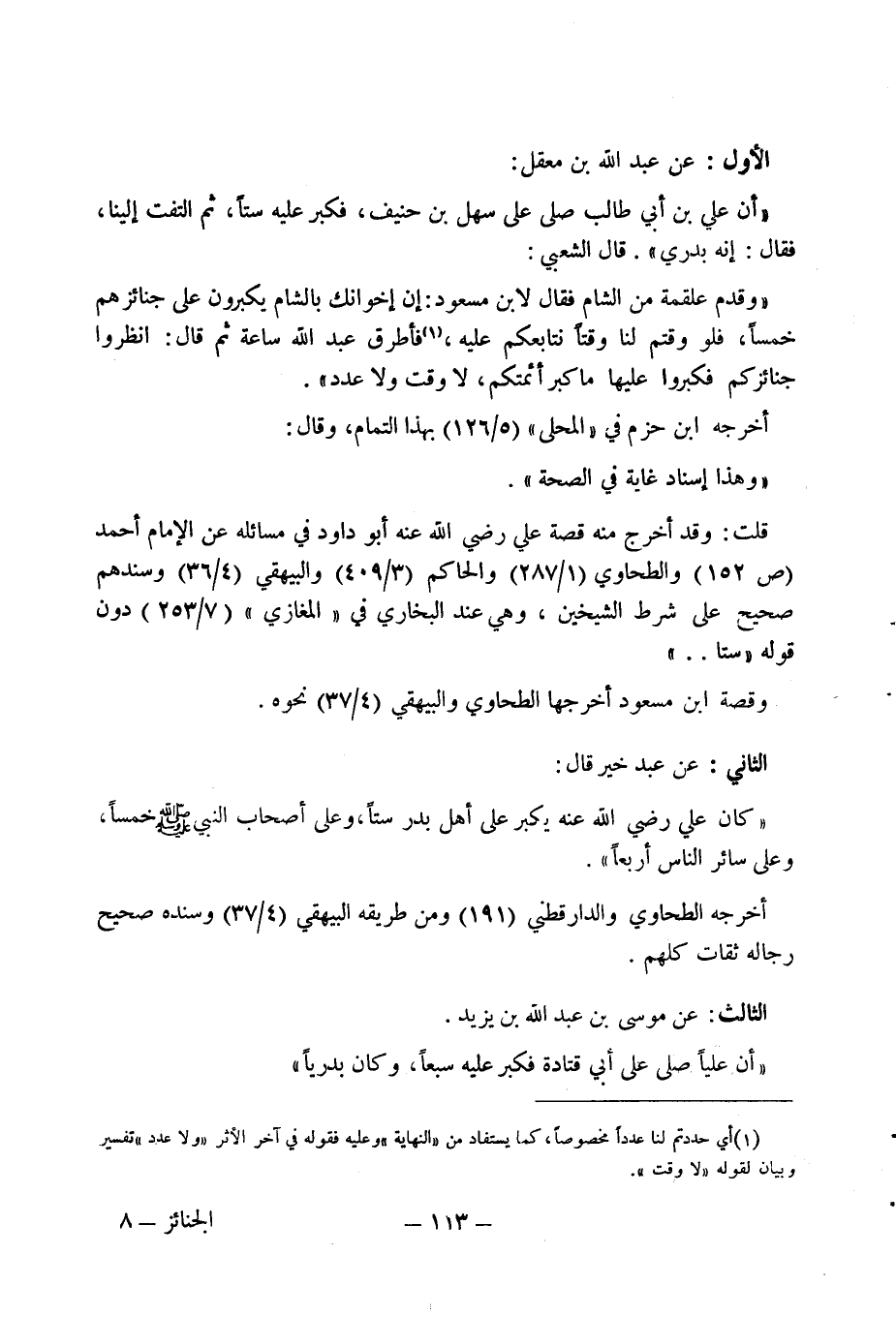 الثاني: عن عبد خير قال: " كان علي رضي الله عنه يكبر على أهل بدر ستا، وعلى أصحاب النبي صلى الله عليه وسلم خمسا، وعلى سائر الناس أربعا ".