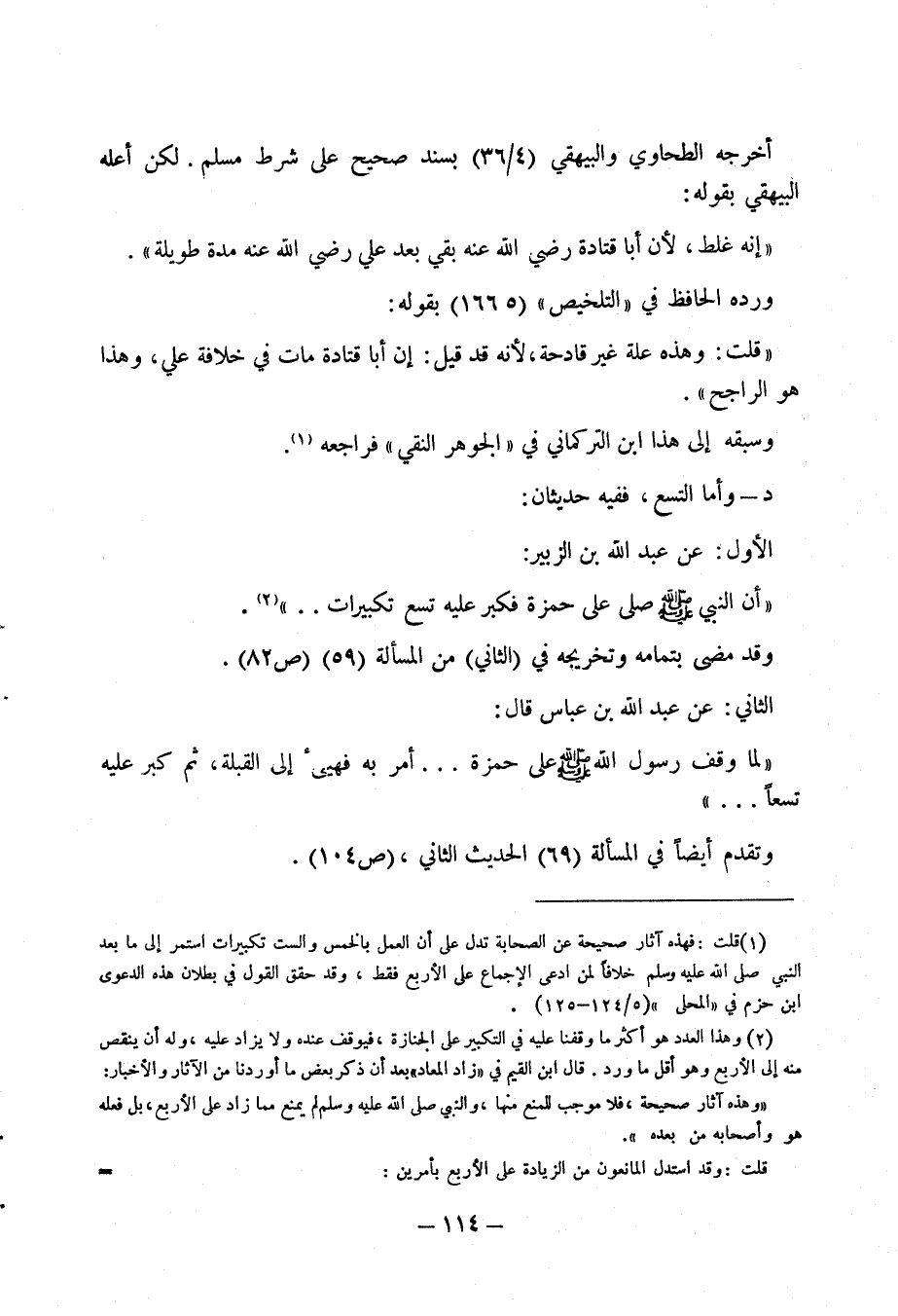 (1) قلت: فهذه آثار صحيحه عن الصحابة تدل على أن العمل بالخمس والست تكبيرات الستمر إلى ما بعد النبي صلى الله عليه وسلم خلافا لمن ادعى الاجماع على الاربع فقط، وقد حقق القول في بطلان هذه الدعوى ابن حزم في " المحل " (5/ 124 - 125).