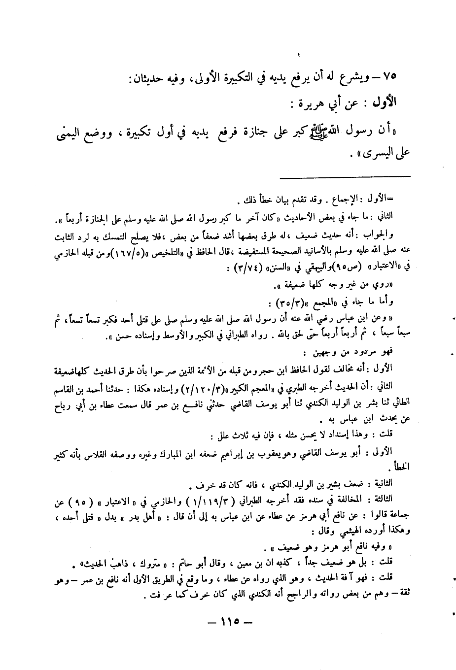 75 - ويشرع له أن يرفع يديه في التكبيرة الأولى، وفيه حديثان:
