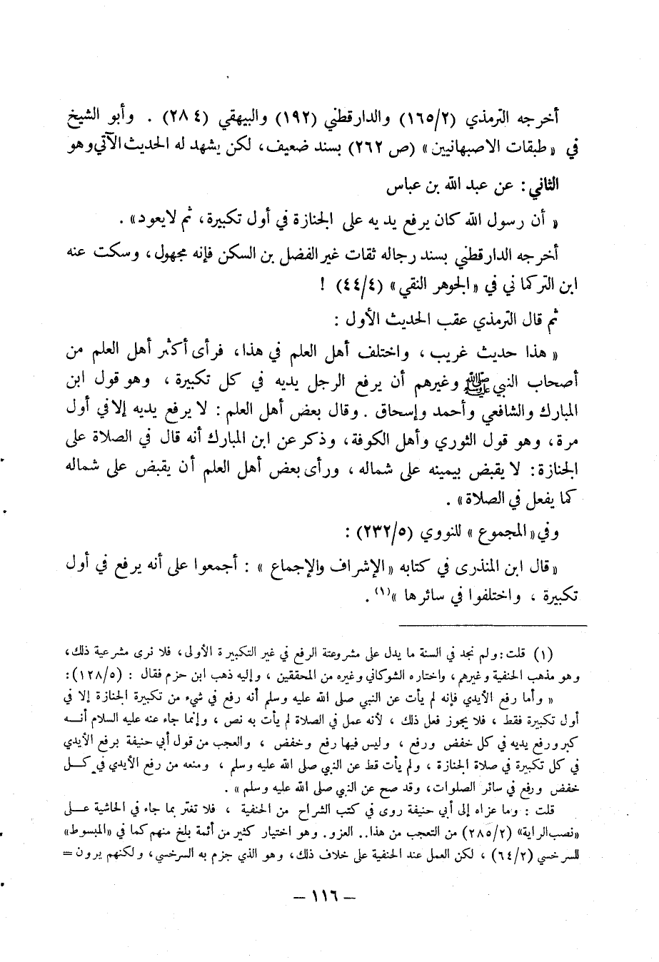 (1) قلت: ولم نجد في السنة ما يدل على مشروعية الرفع في غير التكبيرة الأولى، فلا نرى مشرعية ذلك، وهو مذهب الحنفية وغيرهم، واختاره الشوكاني وغيره من المحققين، وإليه ذهب ابن حزم فقال: (5/ 128): " وأما رفع الأيدي فإنه لم يأت عن النبي صلى الله عليه وسلم أنه رفع في شئ من تكبيرة الجنازة إلا في أول تكبيرة فقط، فلا يجوز فعل ذلك، لانه عمل في الصلاة لم يأت به نص، وإنما جاء عنه عليه السلام أنه كبر ورفع يديه في كل خفض، ورفع، وليس فيها رفع وخفض، والعجب من قول أبي حنيفة برفع الايدي في كل تكبيرة في صلاة الجنازة، ولم يأت قط عن النبي صلى الله عليه وسلم، ومنعه من رفع الايدي في كل خفض ورفع في سائر الصلوات، وقد صح عن النبي صلى الله عليه وسلم ".