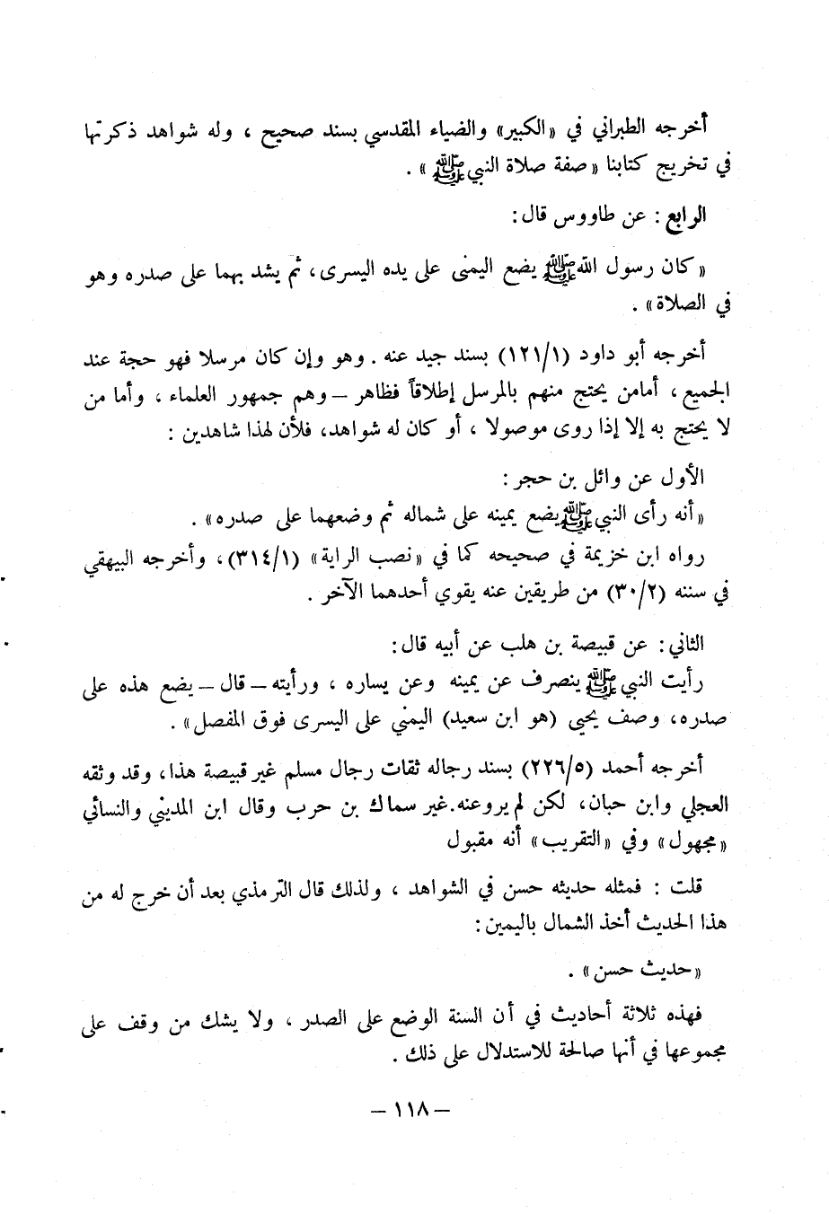 الثاني: عن قبيصة بن هلب عن أبيه قال: رأيت النبي صلى الله عليه وسلم ينصرف عن يمينه وعن يساره، ورأيته - قال - يضع هذه على صدره، وصف يحيى (هو ابن سعيد) اليمني على اليسري فوق المفصل ".