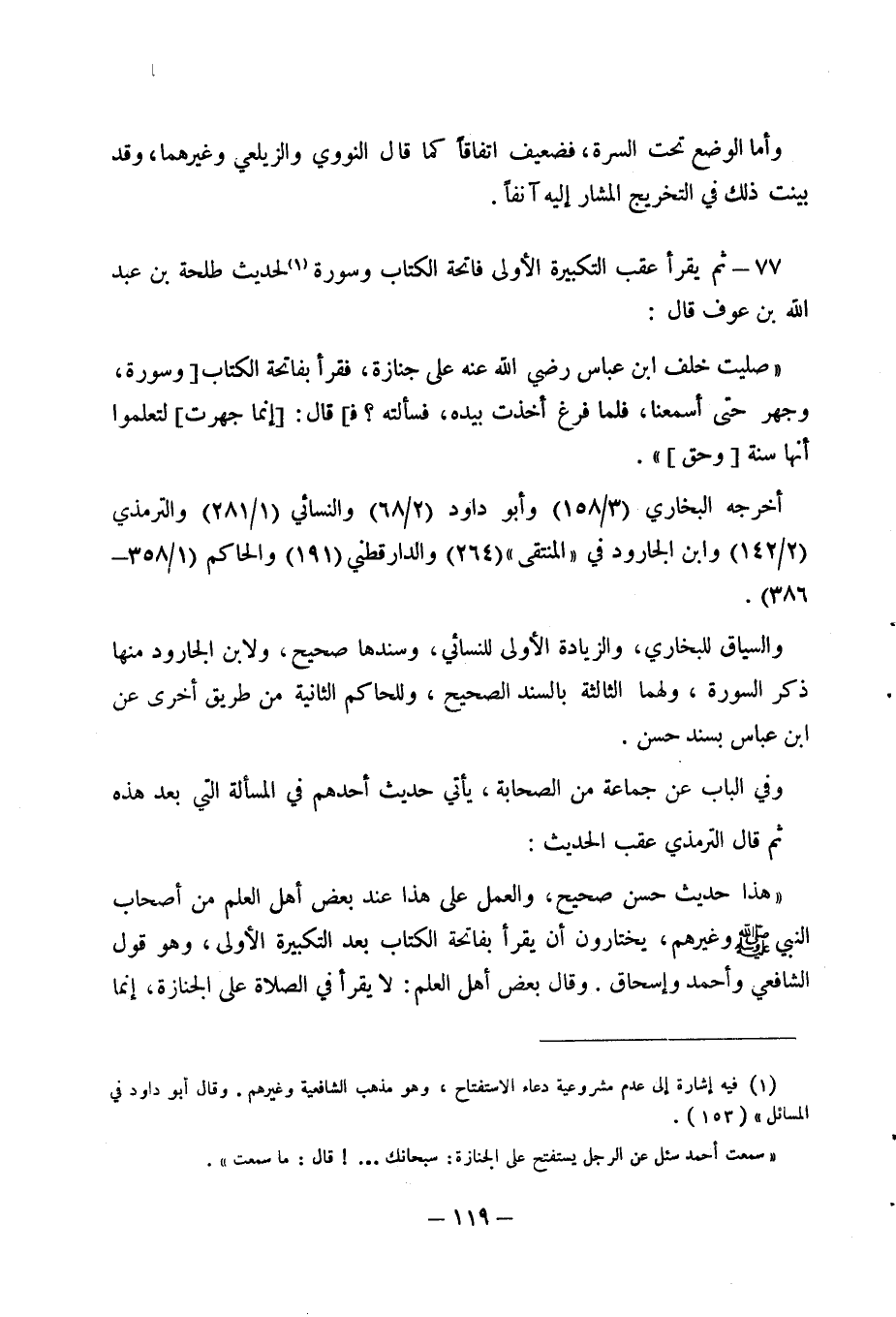 77 - ثم يقرأ عقب التكبيرة الأولى فاتحة الكتاب وسورة (1) لحديث طلحة بن عبد الله بن عوف قال: