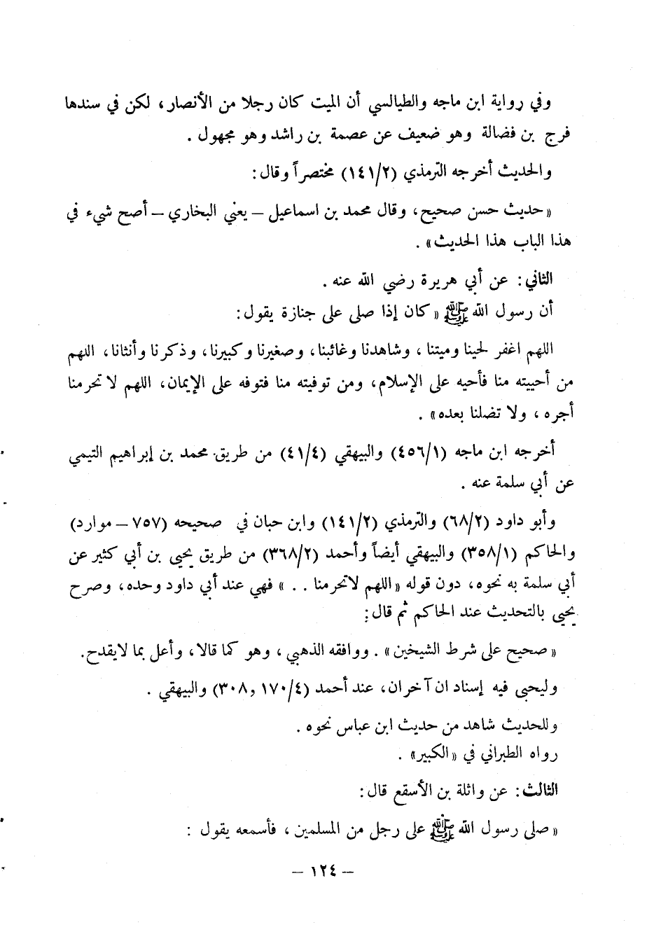 الثالث: عن واثلة بن الاسقع قال: " صلى رسول الله صلى الله عليه وسلم على رجل من المسلمين، فأسمعه يقول: