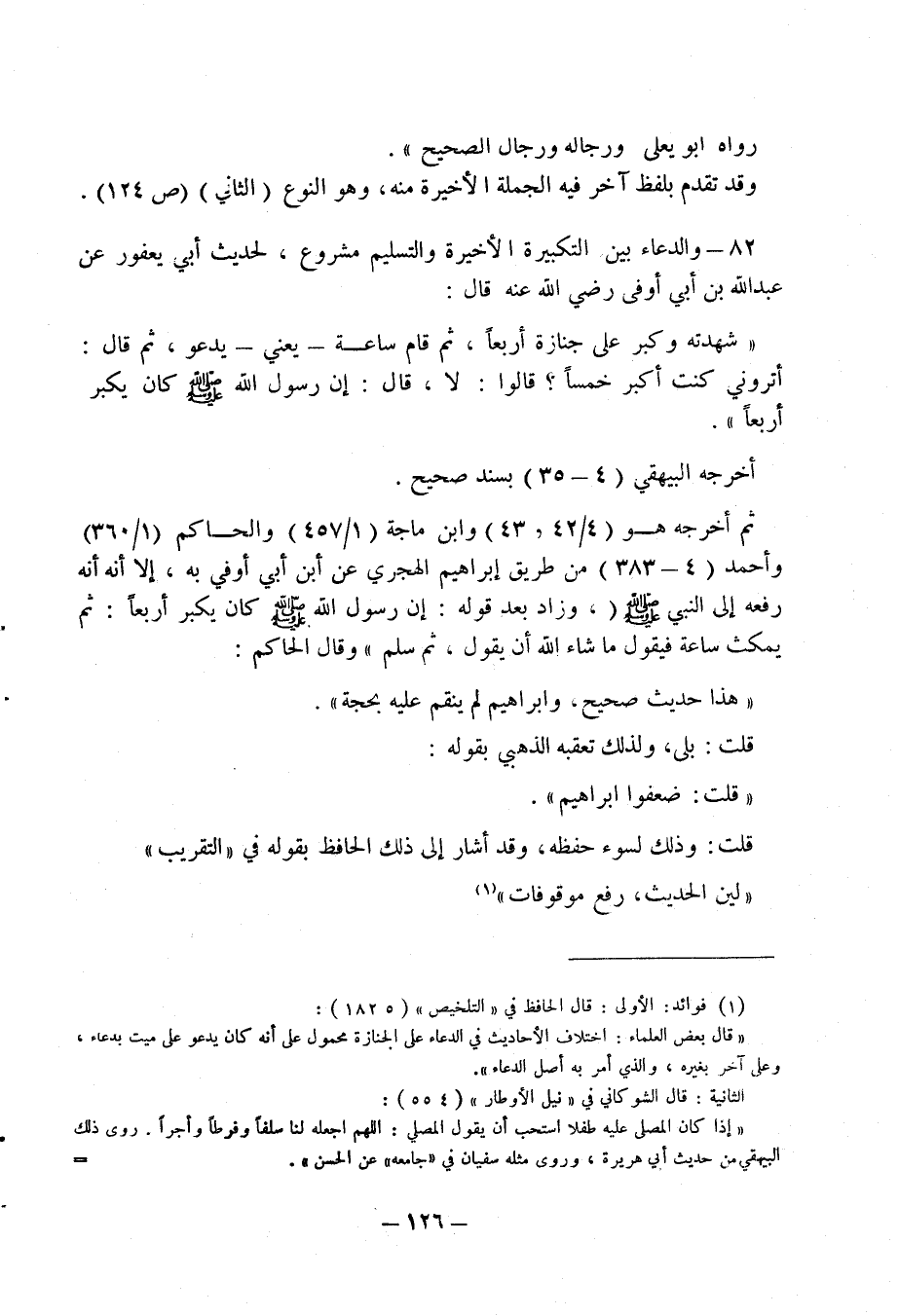 82 - والدعاء بين التكبيرة الاخيرة والتسليم مشروع، لحديث أبي يعفور عن عبد الله بن أبي أوفى رضي الله عنه قال: