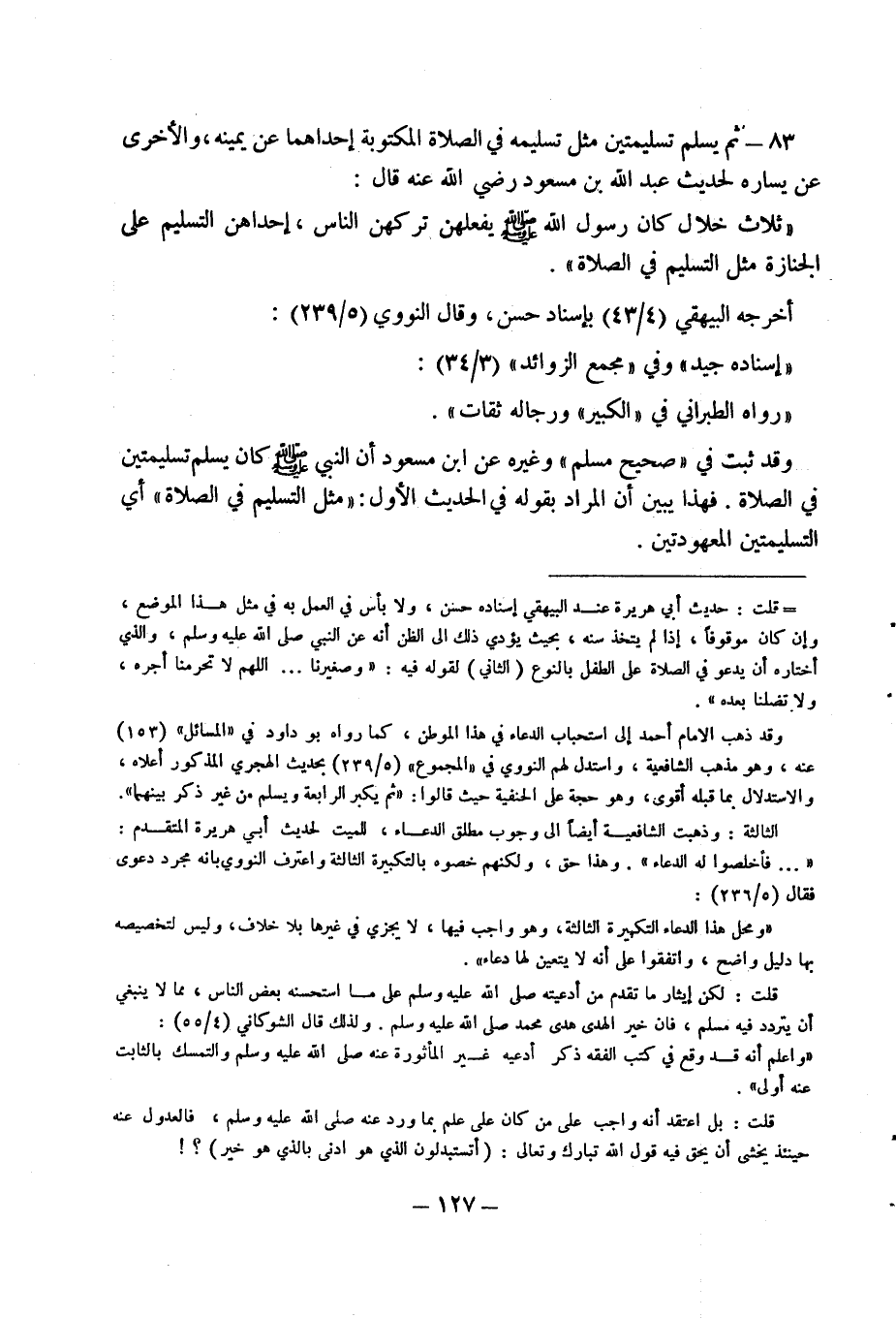 83 - ثم يسلم تسليمتين مثل تسليمه في الصلاة المكتوبة إحداهما عن يمينه، والاخرى عن يساره لحديث عبد الله بن مسعود رضي الله عنه قال: " ثلاث خلال كان رسول الله صلى الله عليه وسلم يفعلهن تركهن الناس، إحداهن التسليم على الجنازة مثل التسليم في الصلاة ".