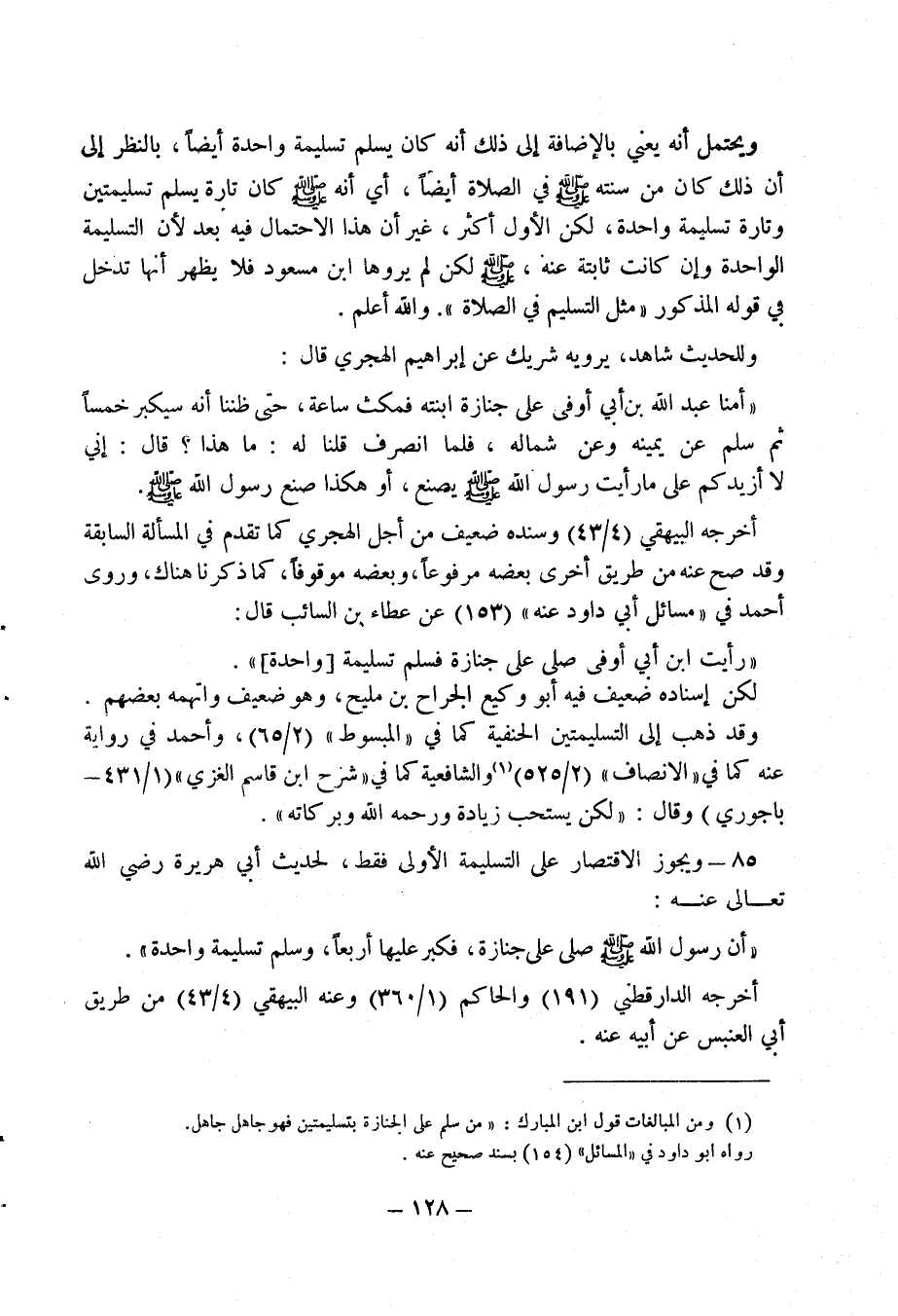 ومن المبالغات قول ابن المبارك: " من سلم على الجنازة بتسليمتين فهو جاهل جاهل.