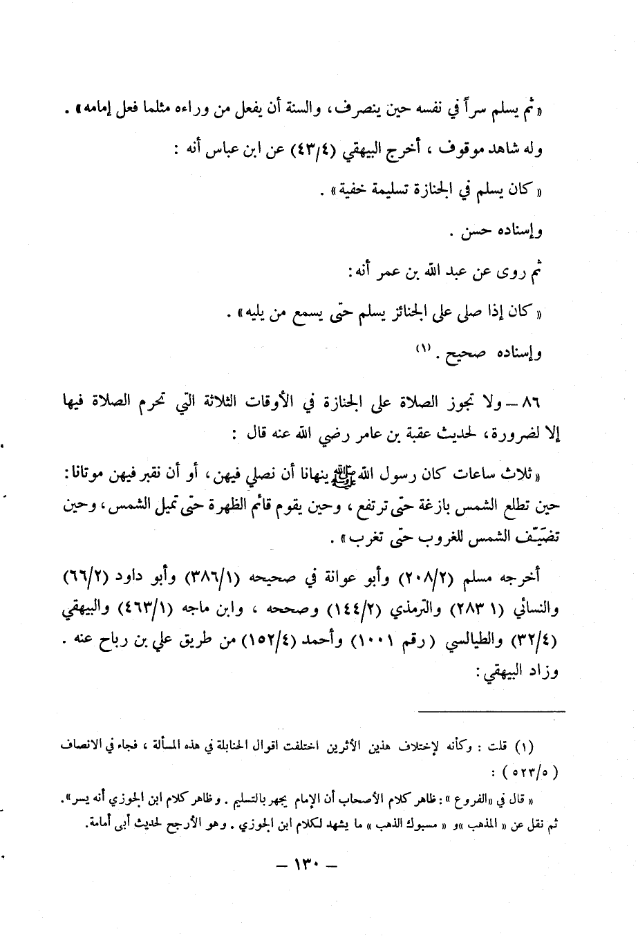 86 - ولا تجوز الصلاة على الجنازة في الاوقات الثلاثة التي تحرم الصلاة فيها إلا لضرورة، لحديث عقبة بن عامر رضي الله عنه قال:
