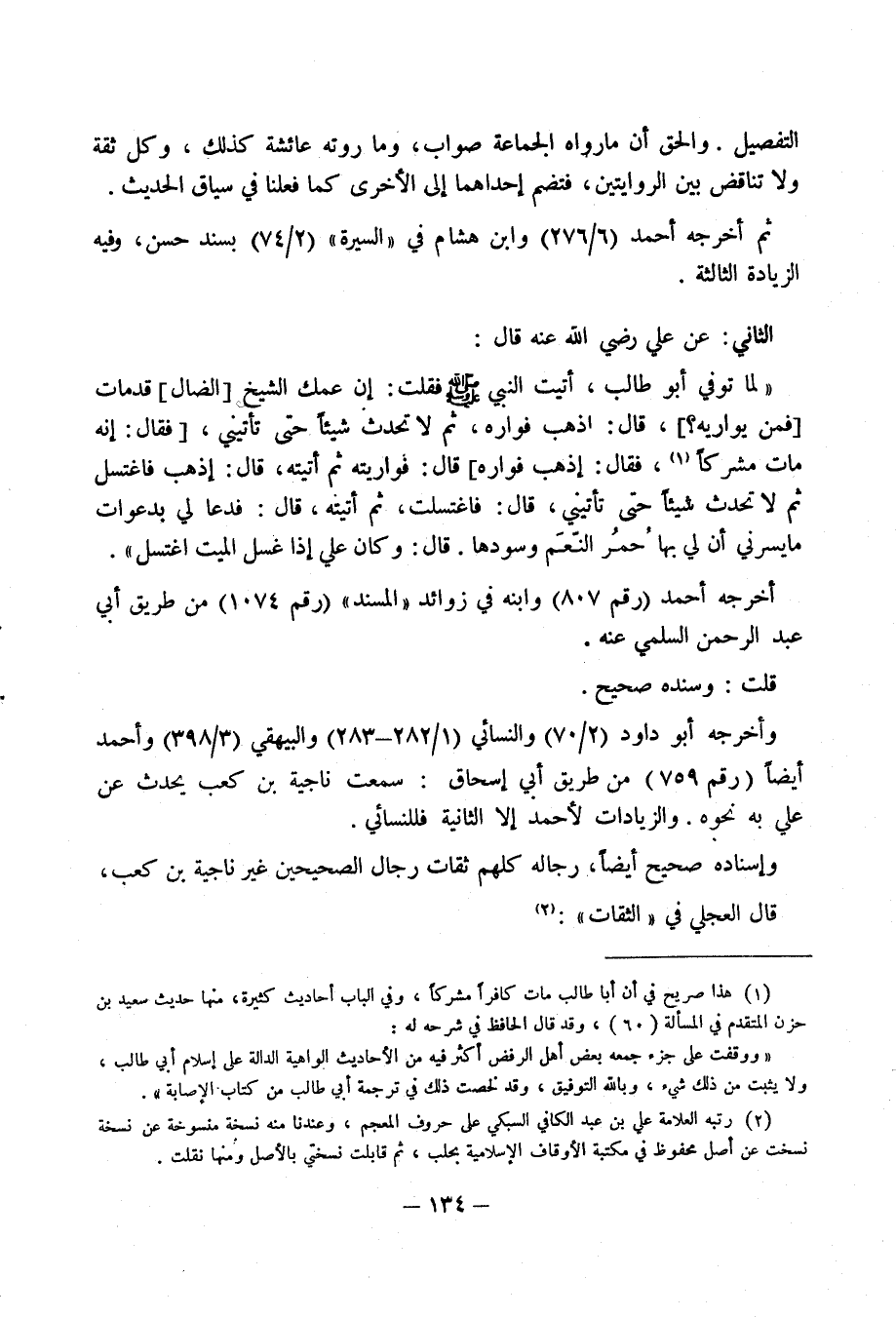 الثاني: عن علي رضي الله عنه قال: " لما توفي أبو طالب، أتيت النبي صلى الله عليه وسلم فقلت: إن عمك الشيخ (الضال) قد مات (فمن يواريه؟)، فقال: اذهب فواره، ثم لا تحدث شيئا حتي تأتيني: (فقال: إنه مات مشركا (1)، فقال: إذهب فواره) قال: فواريته ثم أتيته، قال: إذهب فاغتسل ثم لا تحدث شيئا حتى تأتيني، قال: فاغتسلت، ثم أتيته، قال: فدعا لي بدعوات ما يسرني أن لي بها حمر النعم وسودها.