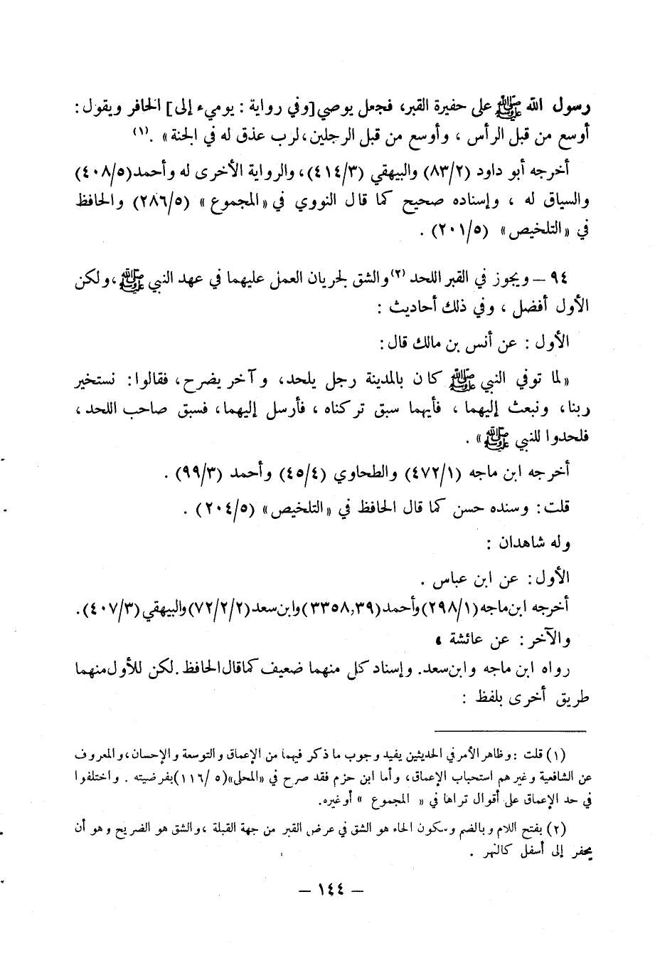 94 - ويجوز في القبر اللحد (2) والشق لجريان العمل عليهما في عهد النبي صلى الله عليه وسلم، ولكن الأول أفضل، وفي ذلك أحاديث:
