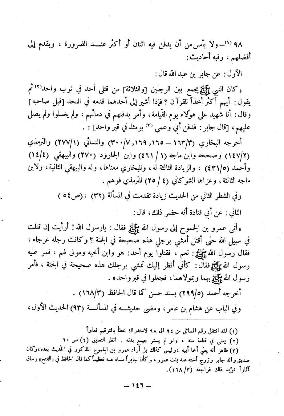 (3) ظاهر أنه يعني أخا أبيه، وليس كذلك بل أراد عمرو بن الجموح المذكور في الحديث بعده، وكان صديق والدجابر وزوج أخته هند بنت عمرو، وكأن جابرا سماه عمه تعظيما كما قال الحافظ في " الفتح " وساق اثارا تؤيد ذلك فراجعه (3/ 168).