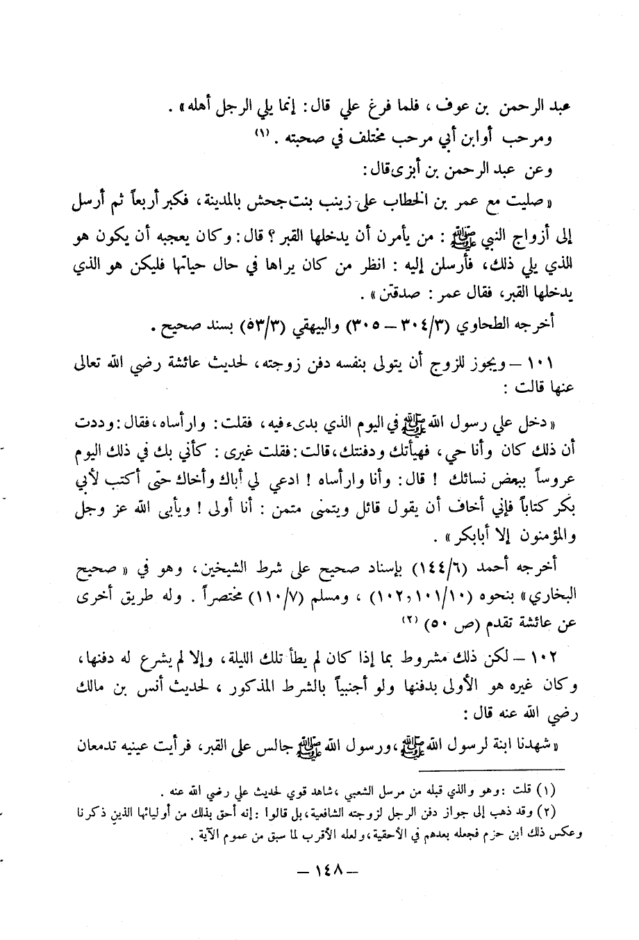 101 - ويجوز للزوج أن أن يتولى بنفسه دفن زوجته، لحديث عائشة رضي الله تعالى عنها قالت: " دخل على رسول الله صلى الله عليه وسلم في اليوم الذي بدئ فيه، فقلت، وارسأه، فقال: وددت أن ذلك كان وأنا حي، فهيأتك ودفنتك، قالت: فقلت غيري: كأني بك في ذلك اليوم عروسا ببعض نسائك قال: وأنا وارأساه ادعي لي أباك وأخاك حتي أكتب لأبي بكر كتابا فإني أخاف أن يقول قائل ويتمنى متمن: أنا أولى ويأبى الله عز وجل والمؤمنون إلا أبا بكر ".