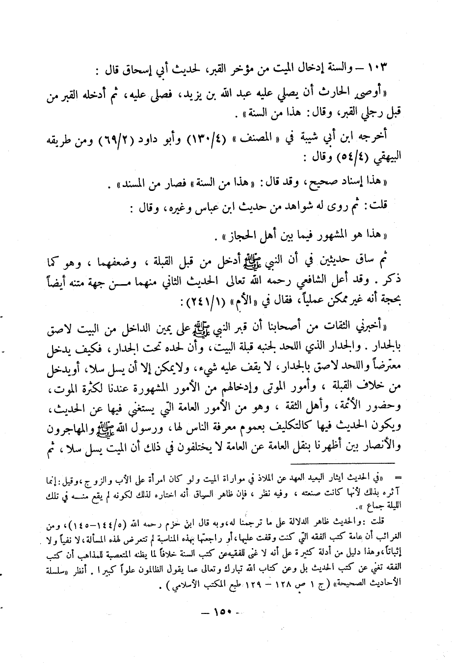 103 - والسنة إدخال الميت من مؤخر القبر، لحديث أبي إسحاق قال: " أوصي الحارث أن يصلي عليه عبد الله بن يزيد، فصلى عليه، ثم أدخله القبر من قبل رجلي القبر وقال: من السنة ".