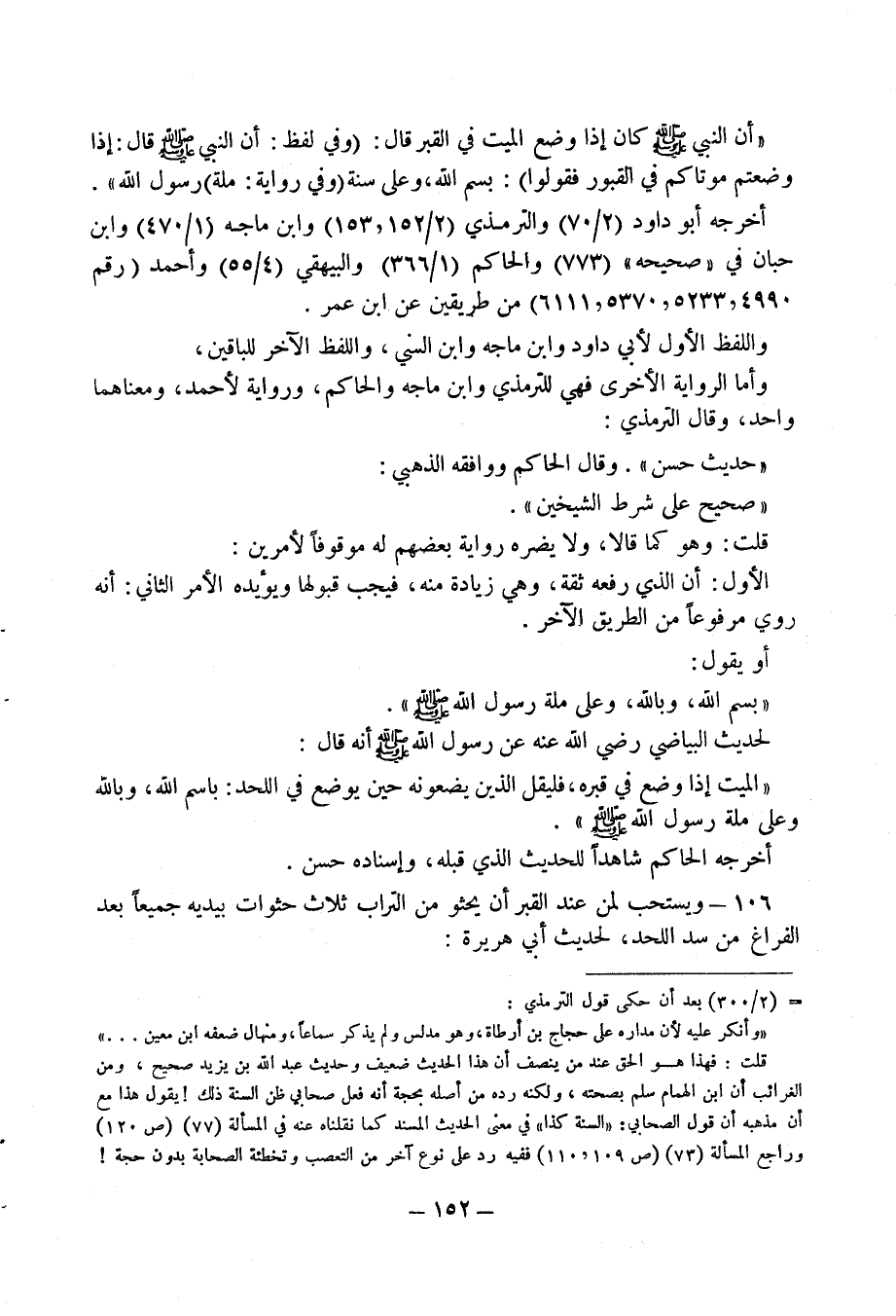 106 - ويستحب لمن عند القبر أن يحثو من التراب ثلاث حثوات بيديه جميعا بعد الفراغ من سد اللحد، لحديث أبي هريرة: