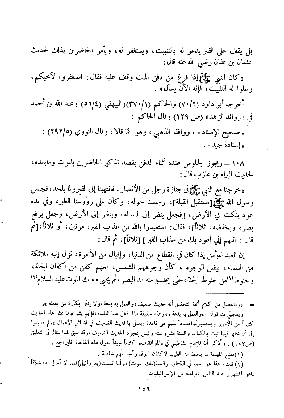 108 - ويجوز الجلوس عنده أثناء الدفن تذكير الحاضرين بالموت وما بعده، لحديث البراء بن عازب قال: " خرجنا مع النبي صلى الله عليه وسلم في جنازة رجل من الانصار، فانتهينا إلى القبر ولما يلحد، فجلس رسول الله صلى الله عليه وسلم (مستقبل القبلة)، وجلسنا حوله، وكأن على رؤوسنا الطير، وفي يده عوده ينكت في الارض، (فجعل ينظر إلى السماء، وينظر إلى الارض، وجعل يرفع بصره ويخفضه، ثلاثا)، فقال: استعيذوا بالله من عذاب القبر، مرتين، أو ثلاثا، (ثم قال: اللهم إني أعوذ بك من عذاب القبر) (ثلاثا)، ثم قال: إن العبد المؤمن إذا كان في انقطاع من الدنيا، وإقبال من الاخرة، نزل إليه ملائكة من السماء، بيض الوجوه، كأن وجوههم الشمس، معهم كفن من أكفان الجنة، وحنوط (1) من حنوط الجنة، حتى يجلسوا منه مد البصر، ثم يجيئ ملك الموت عليه السلام (2)