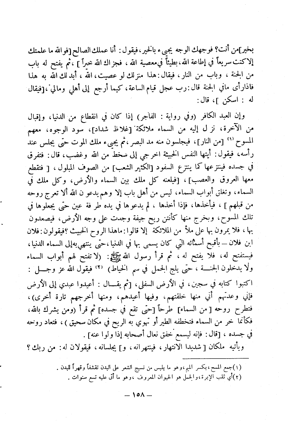 بخير) من أنت فوجهك الوجه يجيئ بالخير، فيقول: أنا عملك الصالح (فوالله ما علمتك إلا كنت سريعا في إطاعة الله، بطيئا في معصية الله، فجزاك الله خيرا)، ثم يفتح له باب من الجنة، وباب من النار، فيقال: هذا منزلك لو عصيت، الله، أبد لك الله به هذا فإذا رأى ما في الجنة قال: رب عجل قيام الساعة، كيما أرجع إلى أهل ومالي، (فيقال له: اسكن)، قال: وإن العبد الكافر (وفي رواية: الفاجر) إذا كان في انقطاع من الدنيا، وإقبال من الاخرة، نزل إليه من السماء ملائكة (غلاظ شداد)، سود الوجوه، معهم المسوح (1) (من النار)، فيجلسون منه مد البصر، ثم يجيئ ملك الموت حتى يجلس عند رأسه، فيقول: إيتها النفس الخبيثة اخرجي إلى سخط من الله وغضب، قال: فتفرق في جسده فينتزعها كما ينتزع السفو (الكثير الشعب) من الصوف المبلول، (فتقطع معها العروق والعصب)، (فيلعنه كل ملك بين السماء والارض، وكل ملك في السماء وتغلق أبواب السماء، ليس من أهل باب إلا وهم يدعون الله ألا تعرج روحه من قبلهم)، فيأخذها، فإذا أخذها، لم يدعوها في يده طرفة عين حتى يجعلوها في تلك المسوح، وبخرج منها كأنتن ريح جيفة وجدت على وجه الارض، فيصعون بها، فلا يمرون بها على ملا من الملائكة إلا قالوا: ما هذا الروح الخبيث؟ فيقولون: فلان ابن فلان - بأقبح أسمائه التي كان يسمى بها في الدنيا، حتى ينتهي به إلى السماء الدنيا فيستفتح له، فلا يفتح له، ثم قرأ رسول الله صلى الله عليه وسلم: (لا تفتح لهم أبواب السماء ولا يدخلون الجنة، حتى يلج الجمل في سم الخياط) (2) فيقول الله عزوجل: اكتبوا كتابه في سجين، في الارض السفلى، (ثم يقال: أعيدوا عبدي إلى الارض فإني وعدتهم أني منها خلقتهم، وفيها أعيدهم، ومنها أخرجهم تارة أخرى)، فتطرح روحه (من السماء) طرحا (حتى تقع في جسده) ثم قرأ {وَمَنْ يُشْرِكْ بِاللَّهِ فَكَأَنَّمَا خَرَّ مِنَ السَّمَاءِ فَتَخْطَفُهُ الطَّيْرُ أَوْ تَهْوِي بِهِ الرِّيحُ فِي مَكَانٍ سَحِيقٍ} [الحج: 31]، فتعاد روحه في جسده، (قال: فإنه ليسمع خفق نعال أصحابه إذا ولو عنه)، ويأتيه ملكان (شديدا الانتهار، فينتهرانه، و) يجلسانه، فيقولان له: من ربك؟
