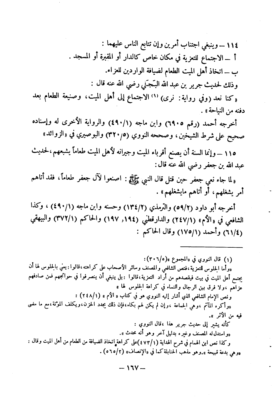 ونص الامام الشافعي الذي أشار إليه النووي هو في كتاب (الام) (1/ 248): (وأكره المآتم، وهي الجماعة، وإن لم يكن لهم بكاء، فإن ذلك يجدد الحزن، ويكلف المؤنة، مع ما مضي فيه من الاثر).