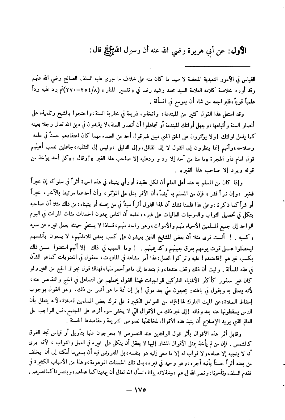 وقابل أثر هذه الاقوال بأثر قول الواقفين عند النصوص لا يخرجون عنها بتأويل أو قياس تجد الفرق كالشمس. فإن من لم يأخذ بمثل الاقوال المشار إليها لا يعقل أن يتكل على غيره في العمل والثواب، لانه يرى أنه لا ينجيه إلا عمله، ولا ثواب له إلا ما سعى إليه هو بنفسه، بل المفروض فيه أن يسعى ما أمكنه إلى أن يخلف من بعده أثرا حسنا يأتيه أجره، وهو وحيد في قبره، بدل تلك الحسنات المرهومة، وهذا من الأسباب الكثيرة في تقدم السلف وتأخرنا، ونصر الله إياهم، وخذلانه إيانا، نسأل الله تعالى أن يهدينا كما هداهم، وينصرنا كما نصرهم.