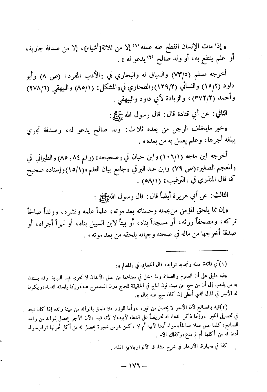 (إذا مات الانسان انقطع عنه عمله (1) إلا من ثلاثة [أشياء]، إلا من صدقة جارية، أو علم ينتفع به، أو ولد صالح (2) يدعو له).