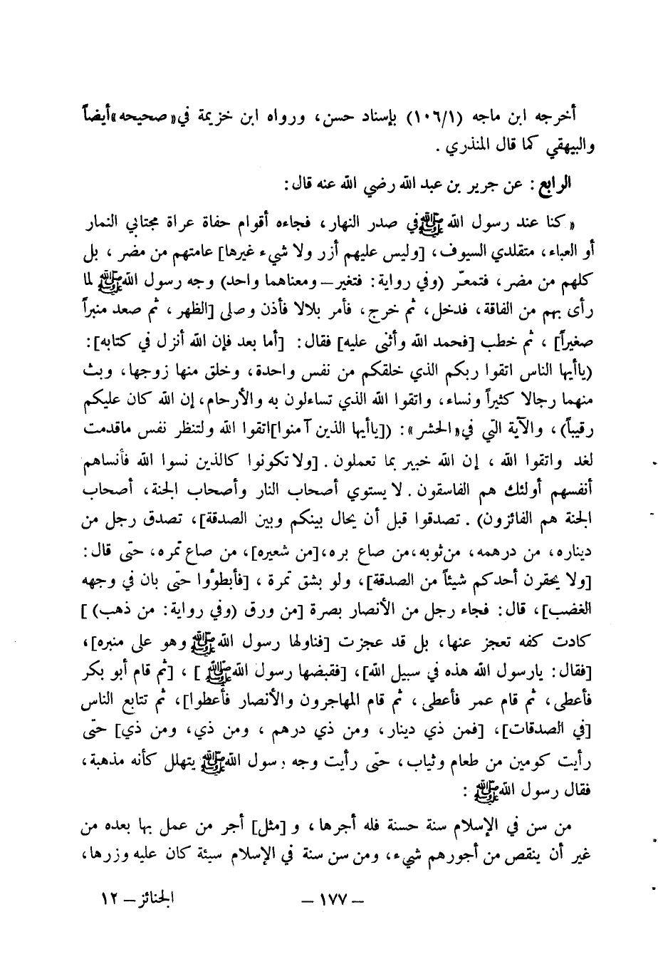 كلهم من مضر، فتمعر (وفي رواية: فتغير - ومعناهما واحد) وجه رسول الله صلى الله عليه وسلم لما رأى بهم من الفاقة، فدخل، ثم خرج، فأمر بلالا فأذن وصلى [الظهر، ثم صعد منبرا صغيرا]، ثم خطب [فحمد الله وأثنى عليه] فقال: [أما بعد فإن الله أنزل في كتابه]: {يَا أَيُّهَا النَّاسُ اتَّقُوا رَبَّكُمُ الَّذِي خَلَقَكُمْ مِنْ نَفْسٍ وَاحِدَةٍ وَخَلَقَ مِنْهَا زَوْجَهَا وَبَثَّ مِنْهُمَا رِجَالًا كَثِيرًا وَنِسَاءً وَاتَّقُوا اللَّهَ الَّذِي تَسَاءَلُونَ بِهِ وَالْأَرْحَامَ إِنَّ اللَّهَ كَانَ عَلَيْكُمْ رَقِيبًا} [النساء: 1]، والآية التي في (الحشر): {[يَا أَيُّهَا الَّذِينَ آمَنُوا] اتَّقُوا اللَّهَ وَلْتَنْظُرْ نَفْسٌ مَا قَدَّمَتْ لِغَدٍ وَاتَّقُوا اللَّهَ إِنَّ اللَّهَ خَبِيرٌ بِمَا تَعْمَلُونَ} [الحشر: 18] [{وَلَا تَكُونُوا كَالَّذِينَ نَسُوا اللَّهَ فَأَنْسَاهُمْ أَنْفُسَهُمْ أُولَئِكَ هُمُ الْفَاسِقُونَ (19) لَا يَسْتَوِي أَصْحَابُ النَّارِ وَأَصْحَابُ الْجَنَّةِ أَصْحَابُ الْجَنَّةِ هُمُ الْفَائِزُونَ (20)} [الحشر: 19، 20]. تصدقوا قبل أن يحال بينكم وبين الصدقة]، تصدق رجل من ديناره، من درهمه، من ثوبه، من صاع بره، [من شعيره]، من صاع تمره، حتى قال: [ولا يحقرن أحدكم شيئا من الصدقة]، ولو بشق تمرة، [فأبطؤوا حتى بان في وجهه الغضب]، قال: فجاء رجل من الانصار بصرة [من ورق (وفي رواية: من ذهب)] كادت كفه تعجز عنها، بل قد عجزت [فناولها رسول الله صلى الله عليه وسلم وهو على منبره] [فقال: يا رسول الله هذه في سبيل الله]، [فقبضها رسول الله صلى الله عليه وسلم]، [قام أبو بكر فأعطى، ثم قام عمر فأعطى، ثم قام المهاجرون والانصار فأعطوا]، ثم تتابع الناس [في الصدقات]، [فمن ذي دينار، ومن ذي درهم، ومن ذي، ومن ذي] حتى رأيت كومين من طعام وثياب، حتى رأيت وجه رسول الله صلى الله عليه وسلم يتهلل كأنه مذهبة فقال رسول الله صلى الله عليه وسلم: من سن في الاسلام سنة حسنة فله أجرها، و [مثل] أجر من عمل بها بعده من غير أن ينقص من أجورهم شئ، ومن سن سنة في الاسلام سيئة كان عليه وزرها.