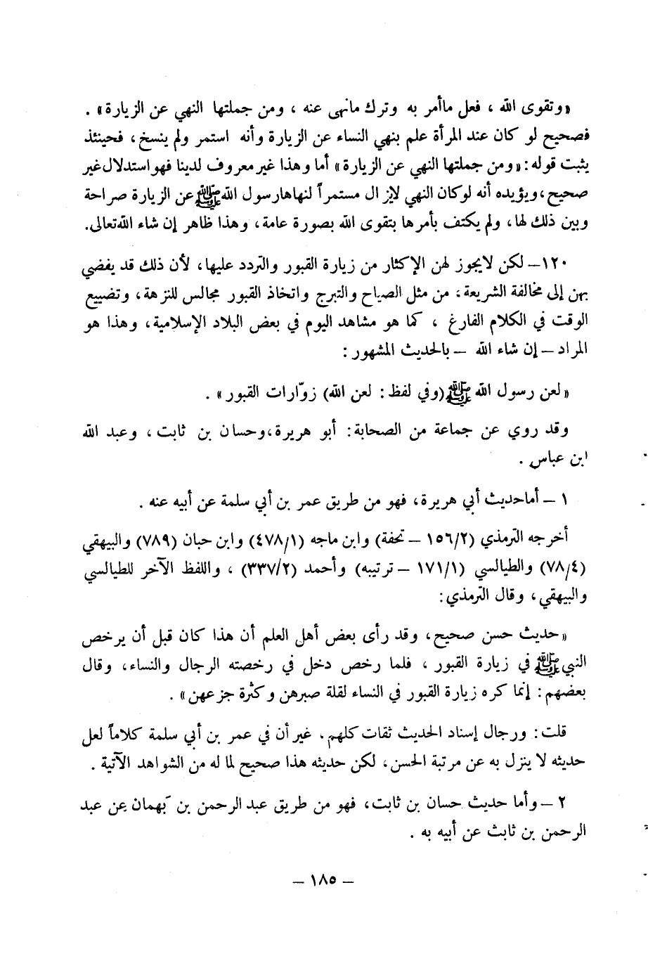 120 - لكن لا يجوز لهن الاكثار من زيارة القبور والتردد عليها، لان ذلك قد يفضي بهن إلى مخالفة الشريعة، من مثل الصياح والتبرج واتخاذ القبور مجالس للنزهة، وتضييع الوقت في الكلام الفارغ، كما هو مشاهد اليوم في بعض، البلاد الاسلامية، وهذا هو المراد - إن شاء الله - بالحديث المشهور: (لعن رسول الله صلى الله عليه وسلم (وفي لفظ: لعن الله) زوارات القبور).
