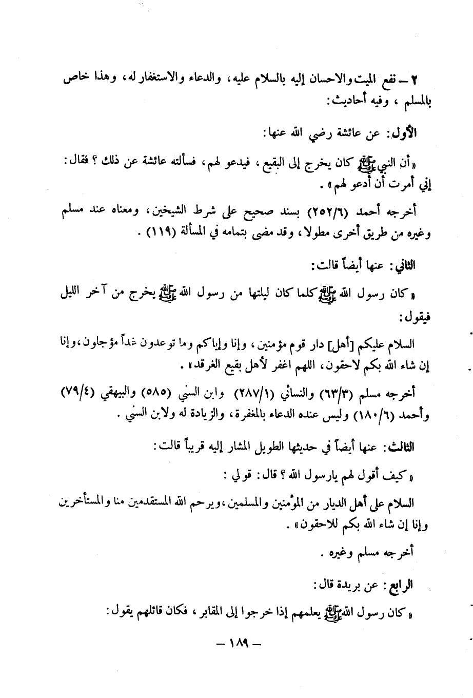 الثالث: عنها أيضا في حديثها الطويل المشار إليه قريبا قالت: (كيف أقول لهم يا رسول الله؟ قال: قولي: السلام على أهل الديار من المؤمنين والمسلمين، ويرحم الله المستقدمين منا والمستأخرين وإنا إن شاء الله بكم للاحقون).