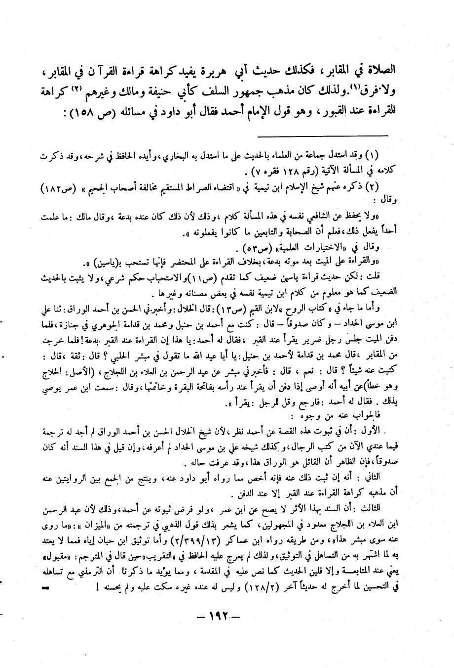 وأما جاء في (كتاب الروح) لابن القيم (ص 13): قال الحلال: وأخبرني الحسن بن أحمد الوارق: ثنا علي ابن موسى الحداد - وكان صدوقا - قال: كنت مع أحمد بن جنبل ومحمد بن قدامة الجوهري في جنازة، فلما دفن الميت جلس رجل ضرير يقرأ عند القبر، فقال له أحمد: يا هذا إن القراءة عند القبر بدعة! فلما خرجت من المقابر، قال محمد بن قدامة لاحمد بن حنبل: يا أبا عبد الله ما تقول في مبشر الحلبي؟ قال: ثقة، قال: كتبت عنه شيئا؟ قال: نعم، قال: فأخبرني مبشر عن عبد الرحمن بن العلاء بن اللجلاج، (الاصل: الحلاج وهو خطأ) عن أبيه أنه أوصي إذا دفن أن يقرأ عند رأسه بفاتحة البقرة وخاتمتها، وقال: سمعت ابن عمر يوصي بذلك.