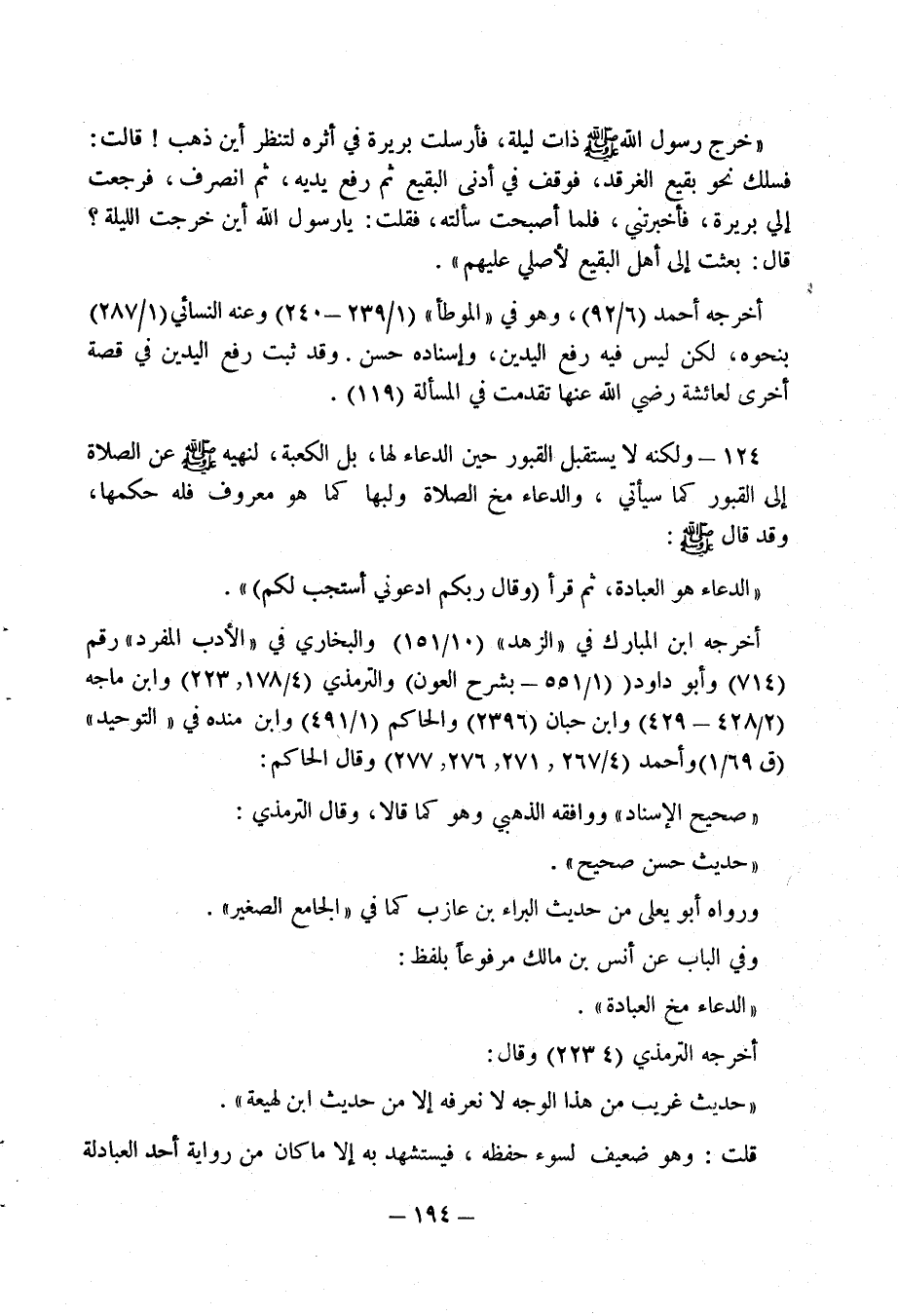 124 - ولكنه لا يستقبل القبور حين الدعاء لها، بل الكعبة، لنهيه صلى الله عليه وسلم عن الصلاة إلى القبور كما سيأتي، والدعاء مخ الصلاة ولبها كما هو معروف فله حكمها، وقد قال صلى الله عليه وسلم: (الدعاء هو العبادة، ثم قرأ (وقال ربكم ادعوني أستجب لكم).